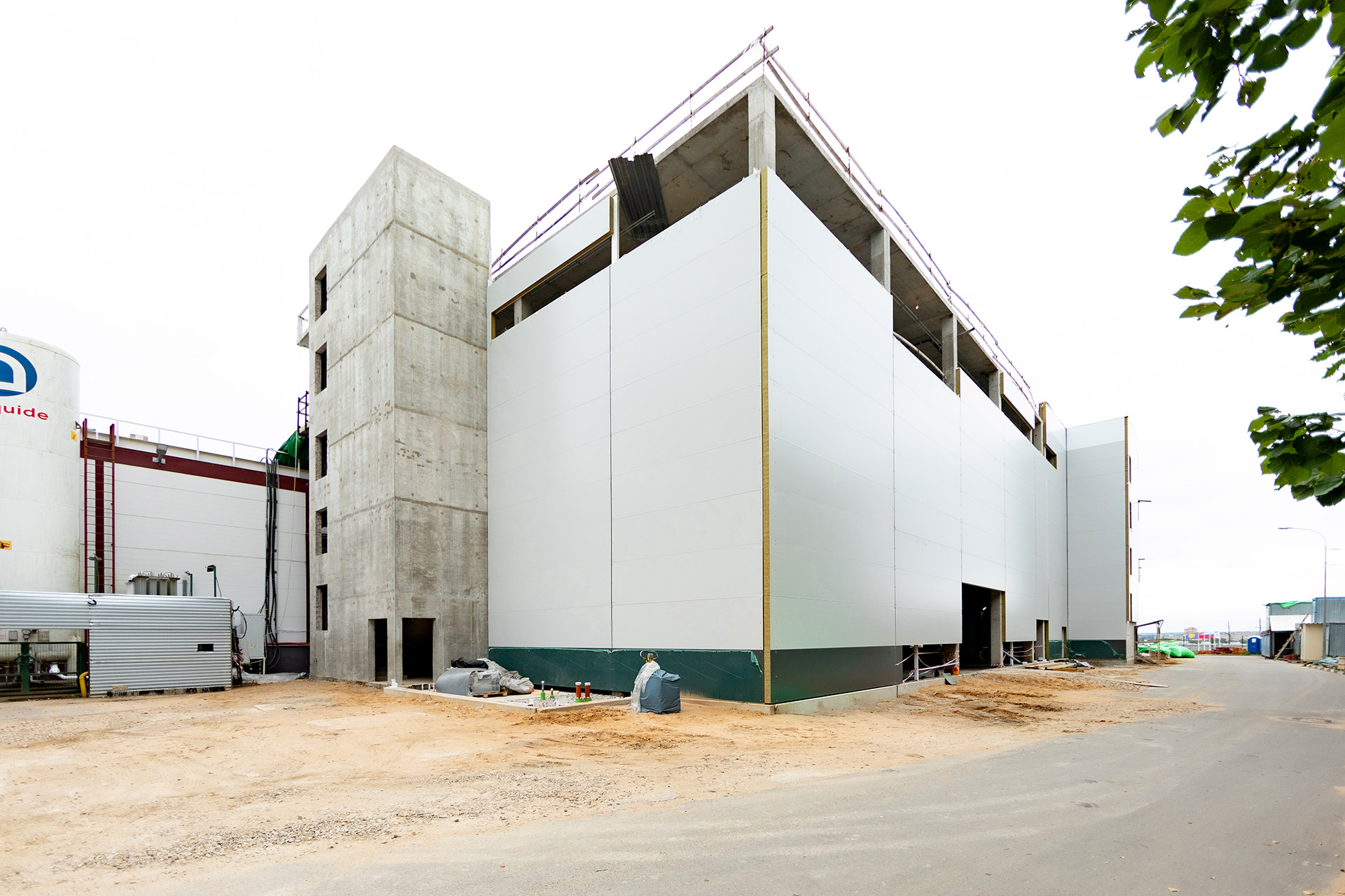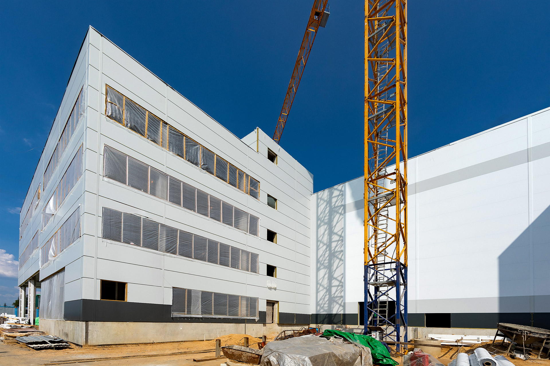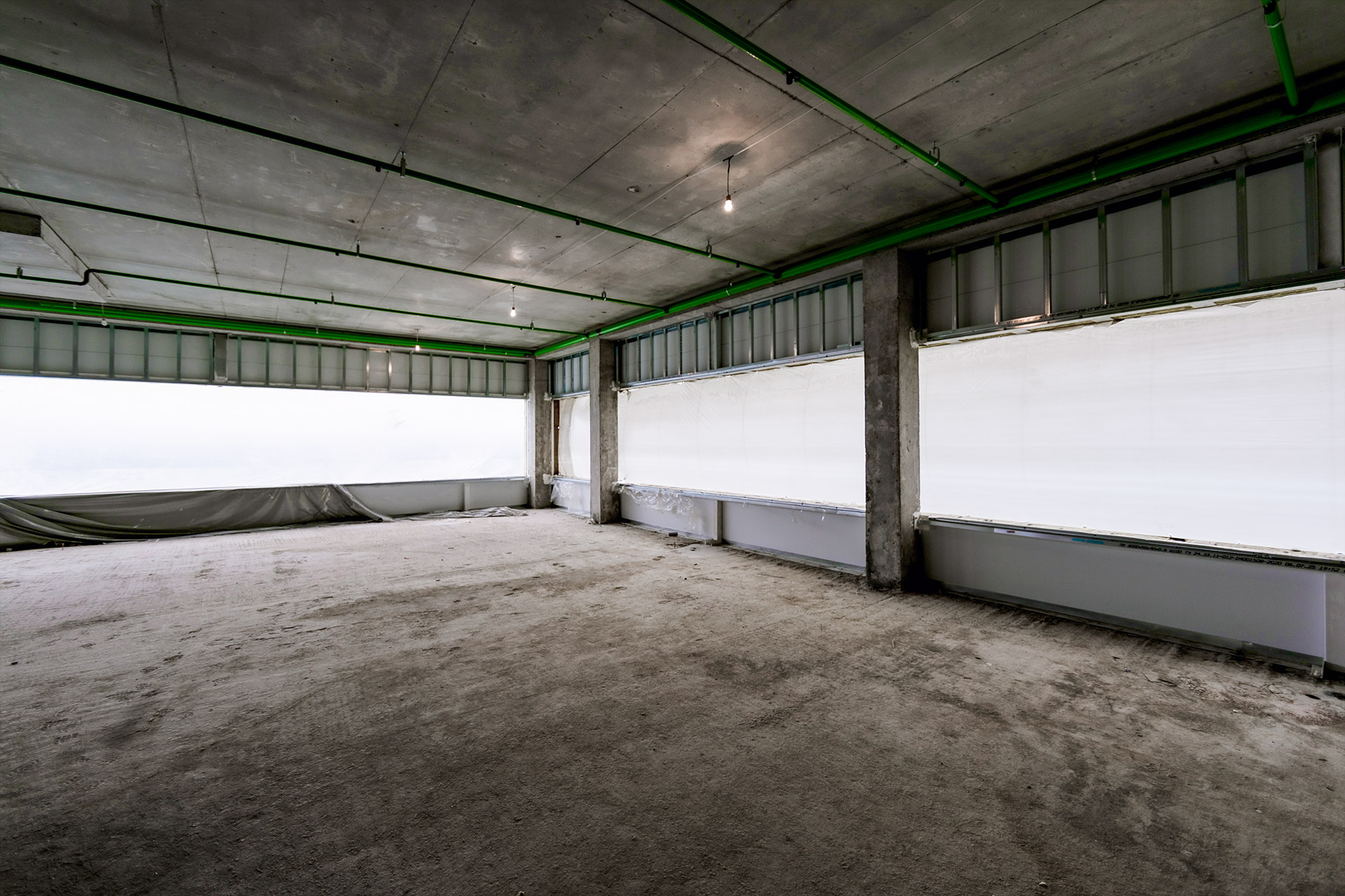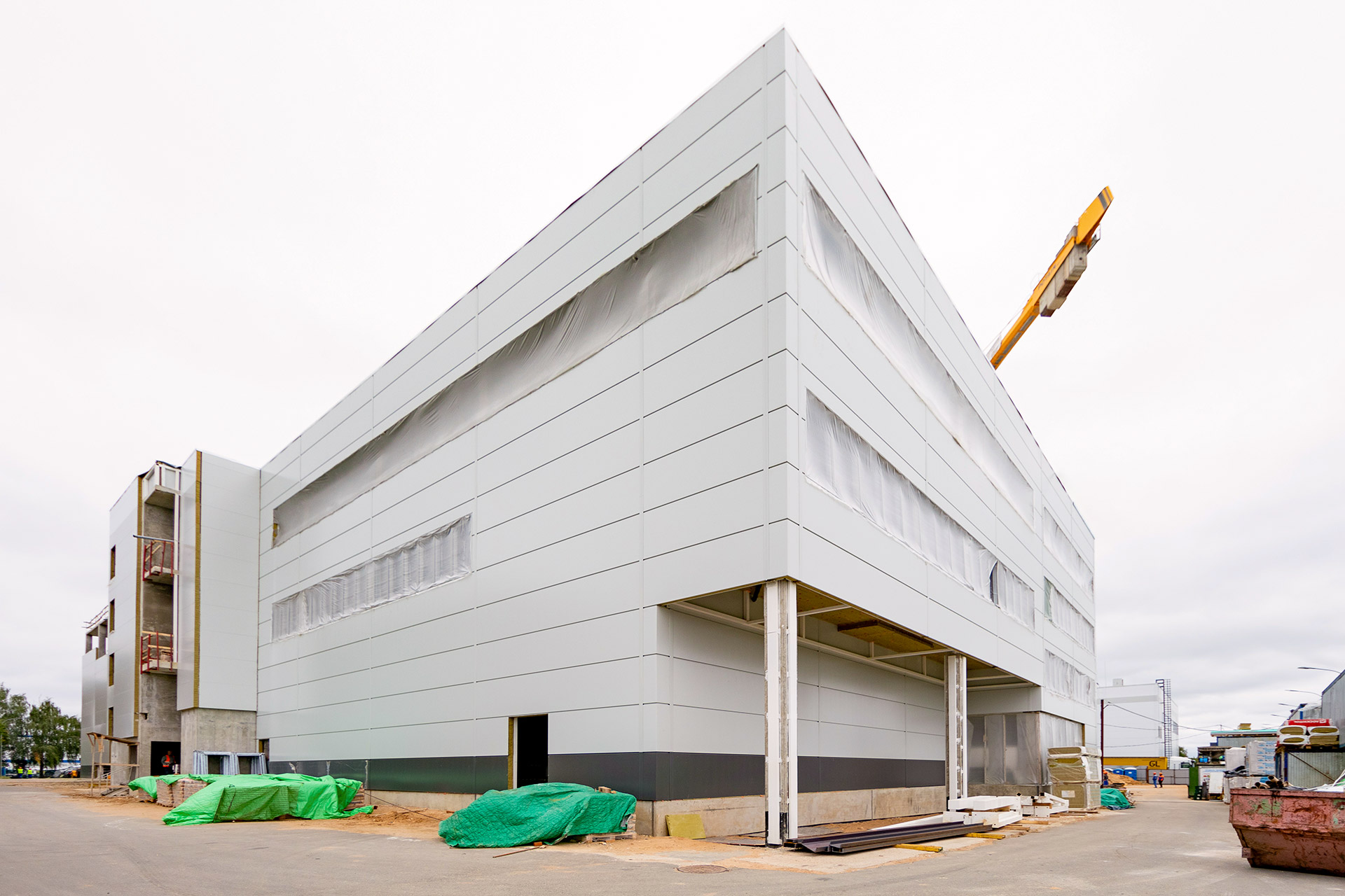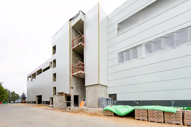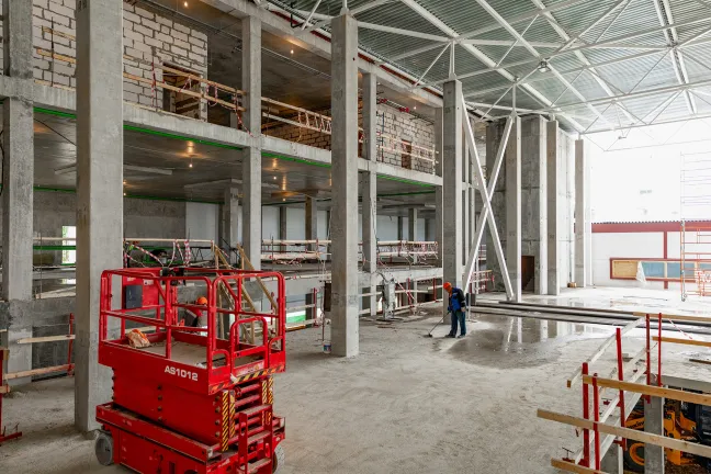 Главное здание: Монтаж фахверков и сэндвич-панелей внутренних перегородок. Монтаж и остекление витражей. Устройство перегородок из пеноблока, штукатурка стен лестниц, монтаж цокольных панелей. Устройство бетонных полов.