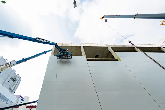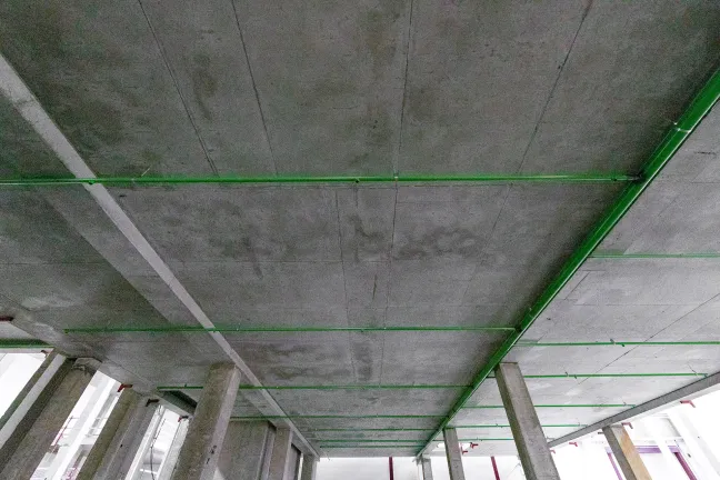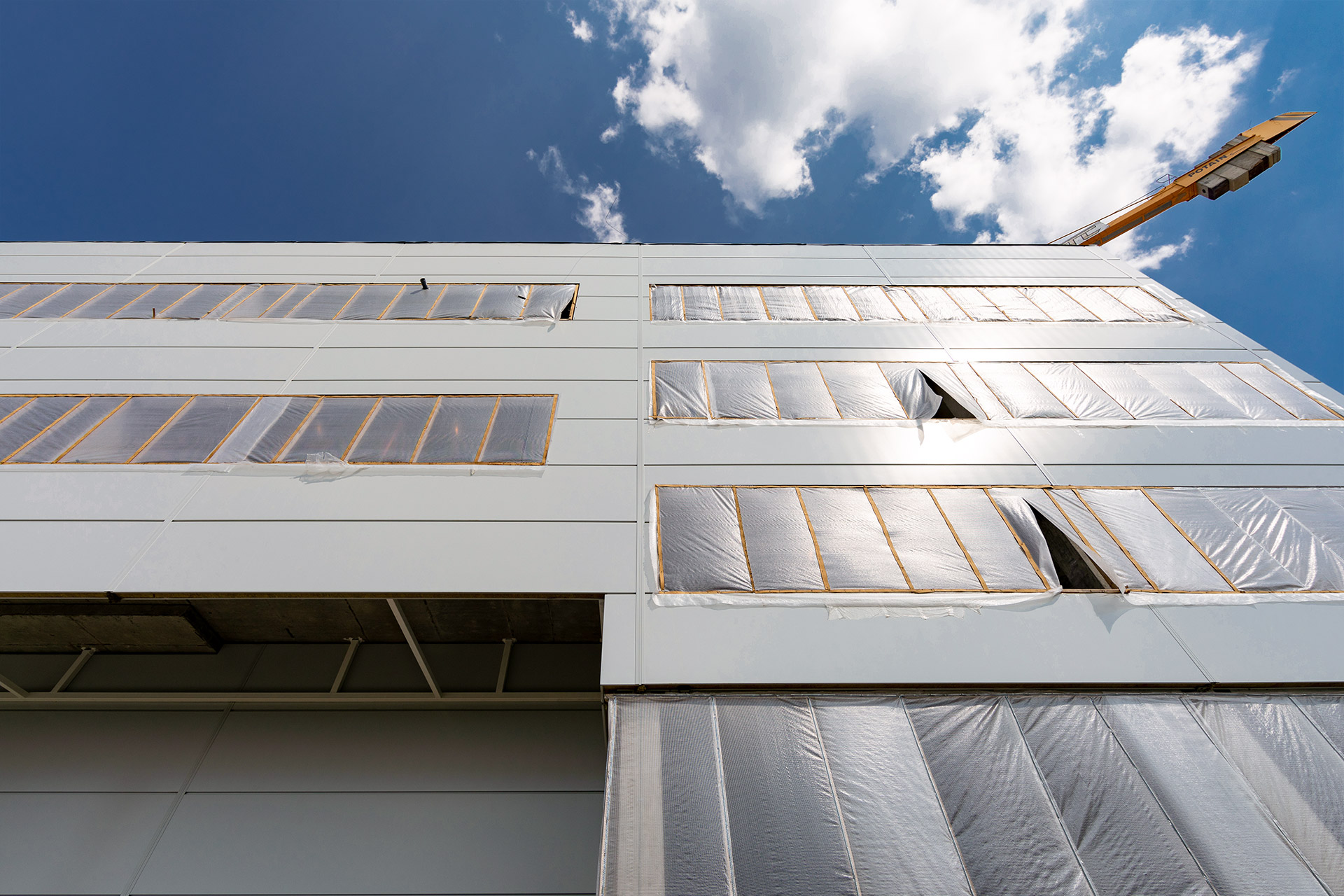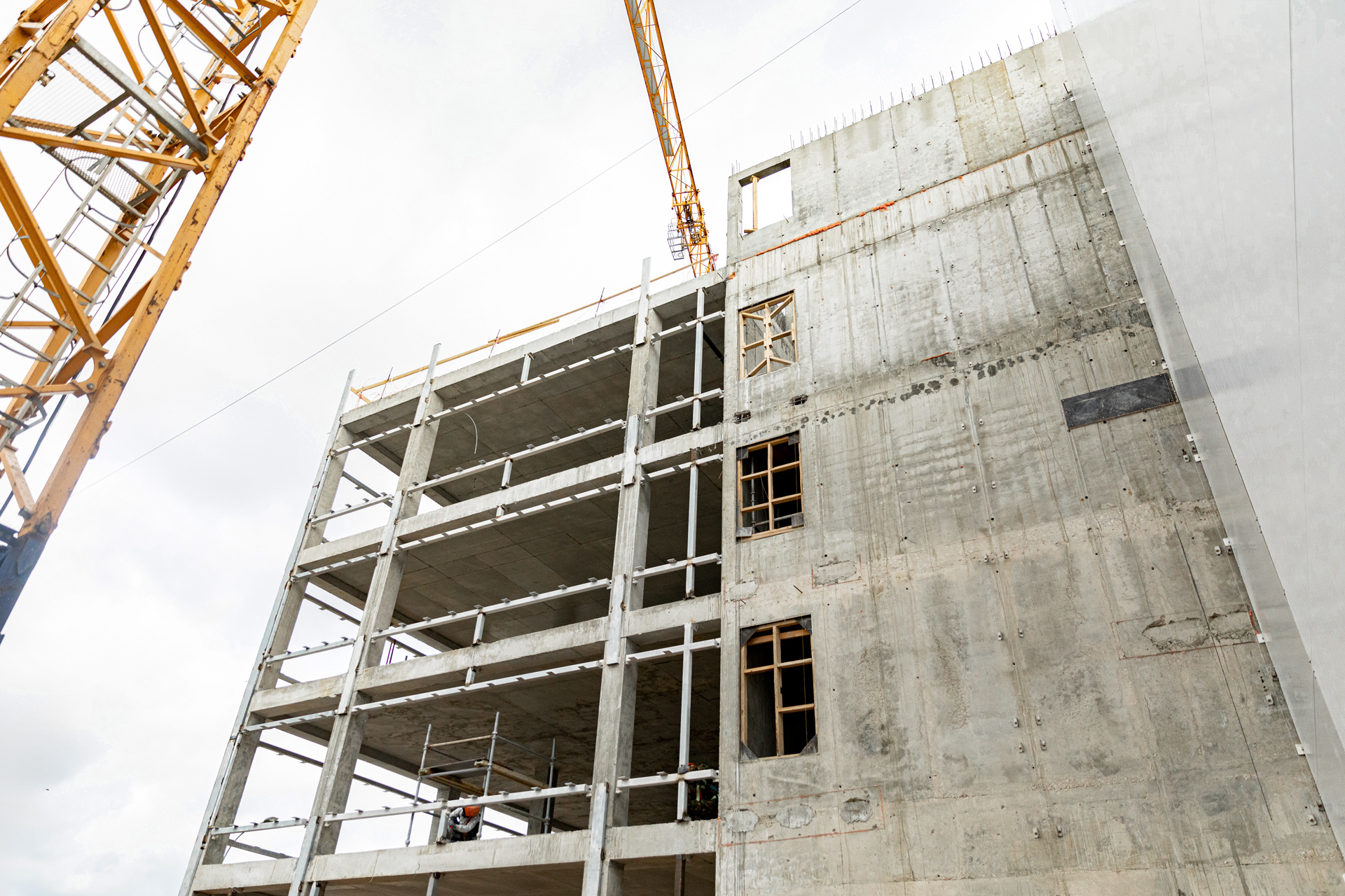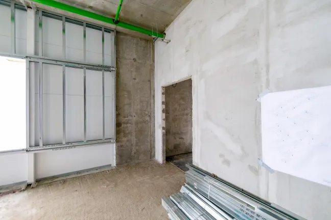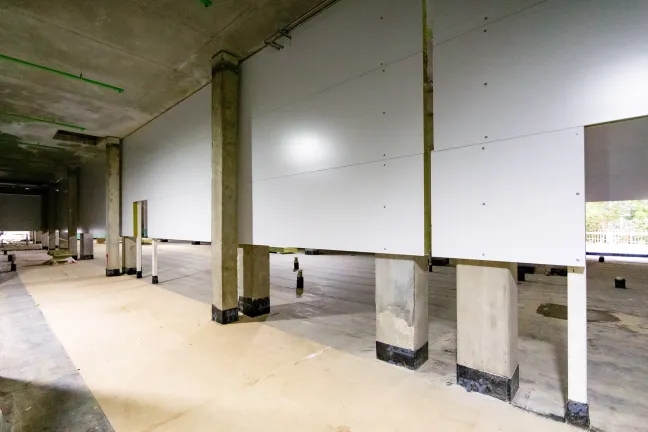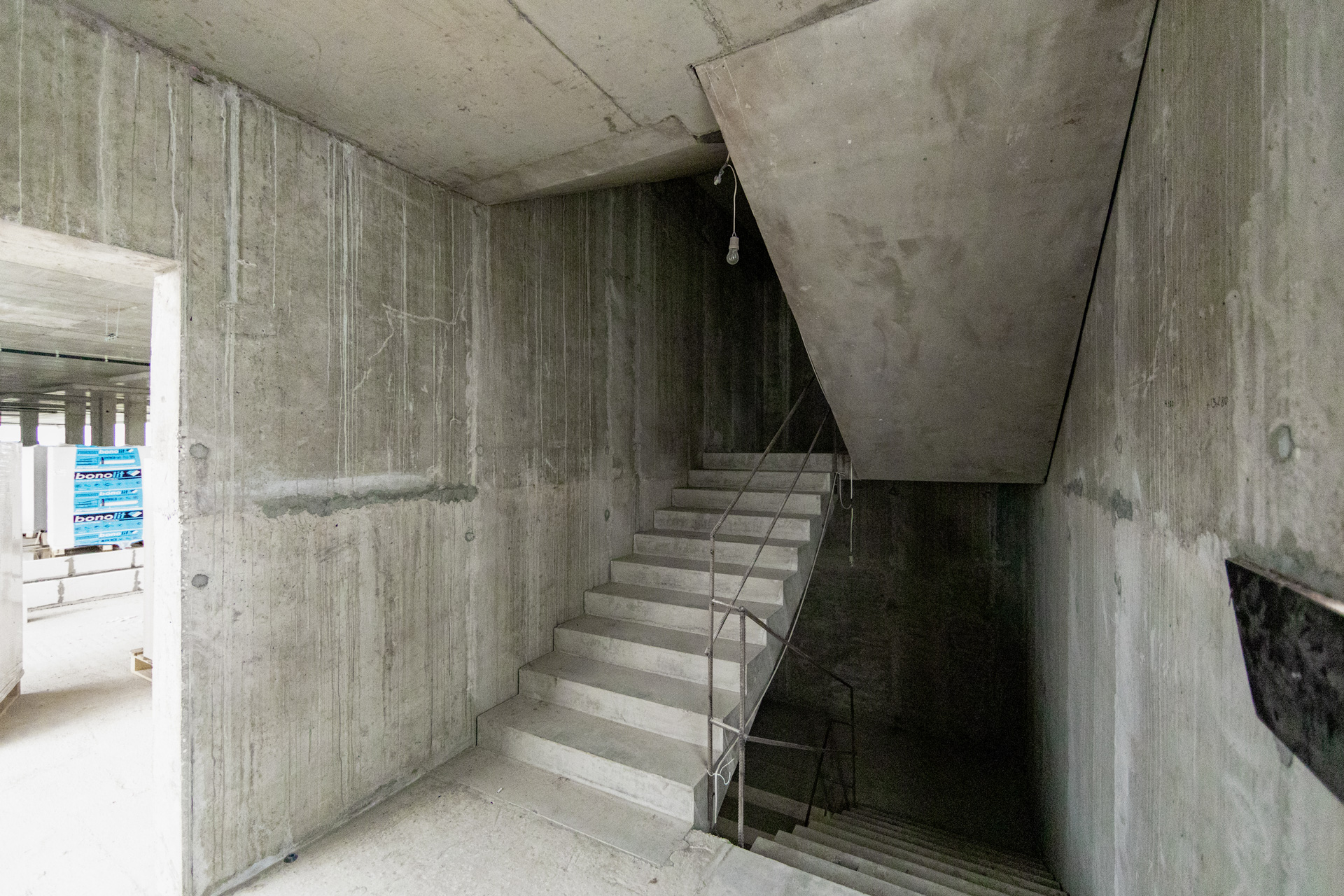 Главное здание: Монтаж фахверков и сэндвич-панелей внутренних перегородок. Монтаж и остекление витражей. Устройство перегородок из пеноблока, штукатурка стен лестниц, монтаж цокольных панелей. Устройство бетонных полов.