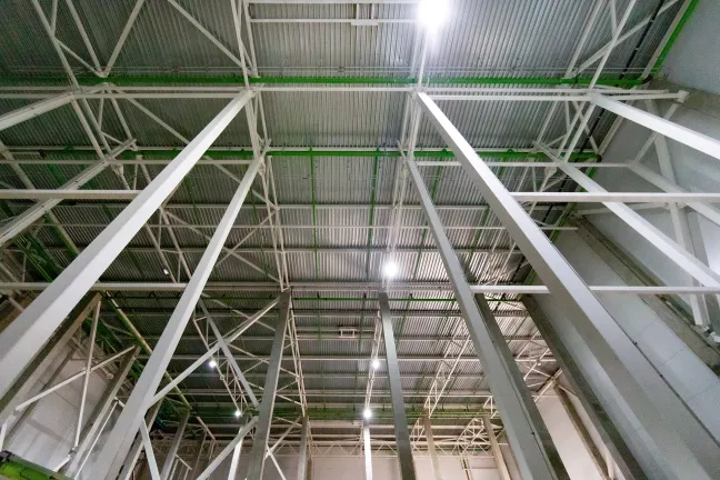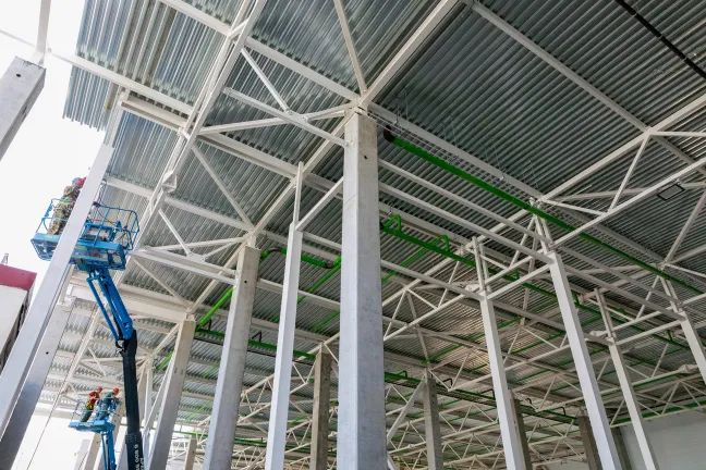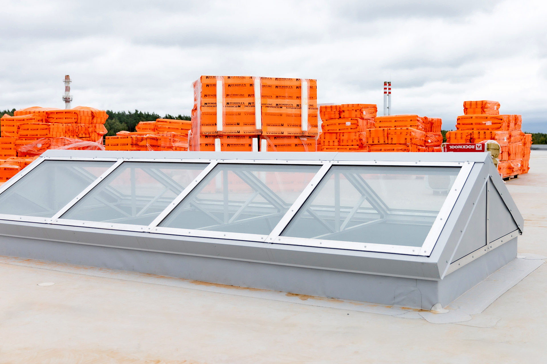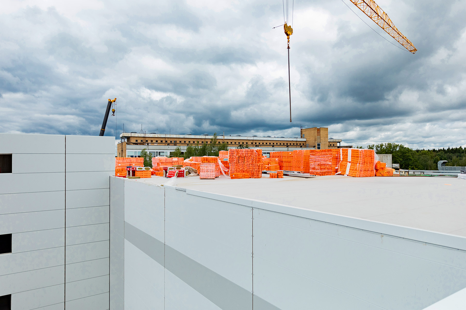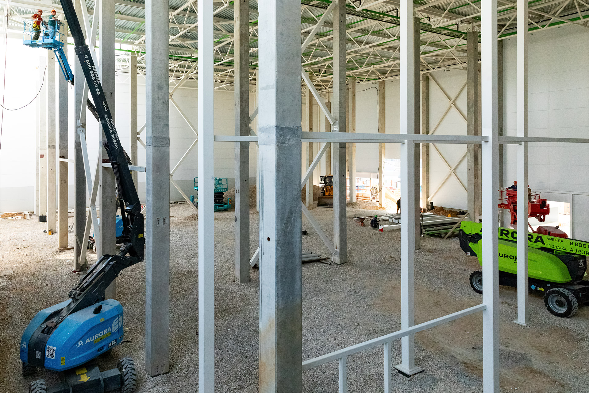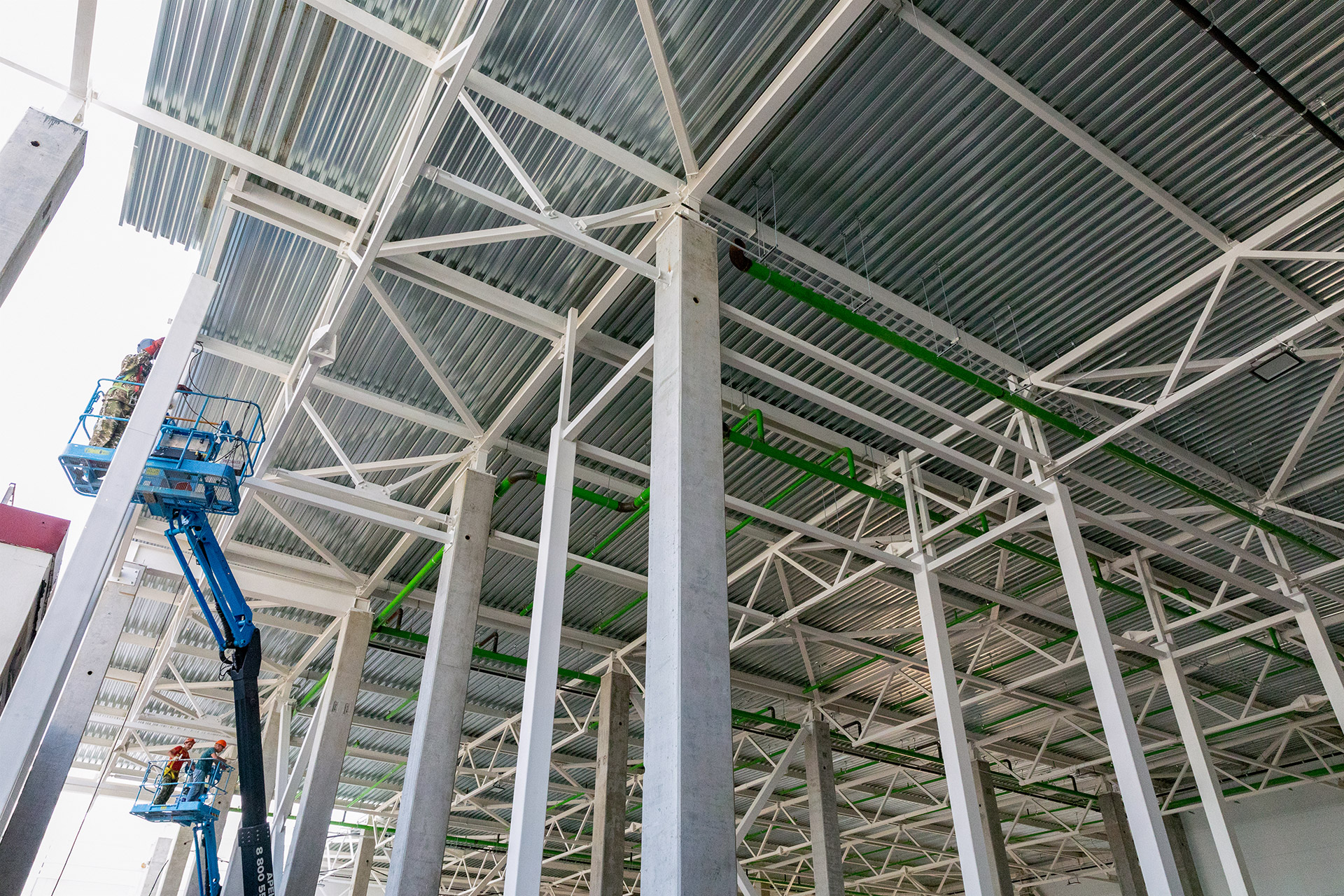 Зона склада: Монтаж профлиста, разуклонки и кровельного пирога. Устройство парапетов и контура заземления. Монтаж металлоконструкций фахверков и труб системы АУПТ.