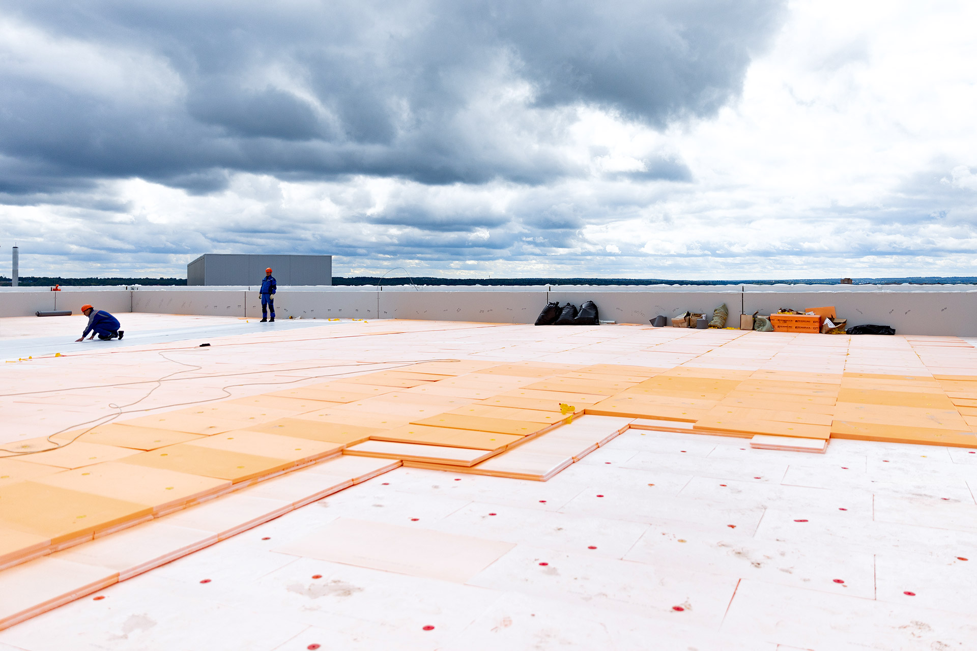 АБЛК: Монтаж утеплителя и устройство парапетной крышки на кровле. Гидроизоляция полов.