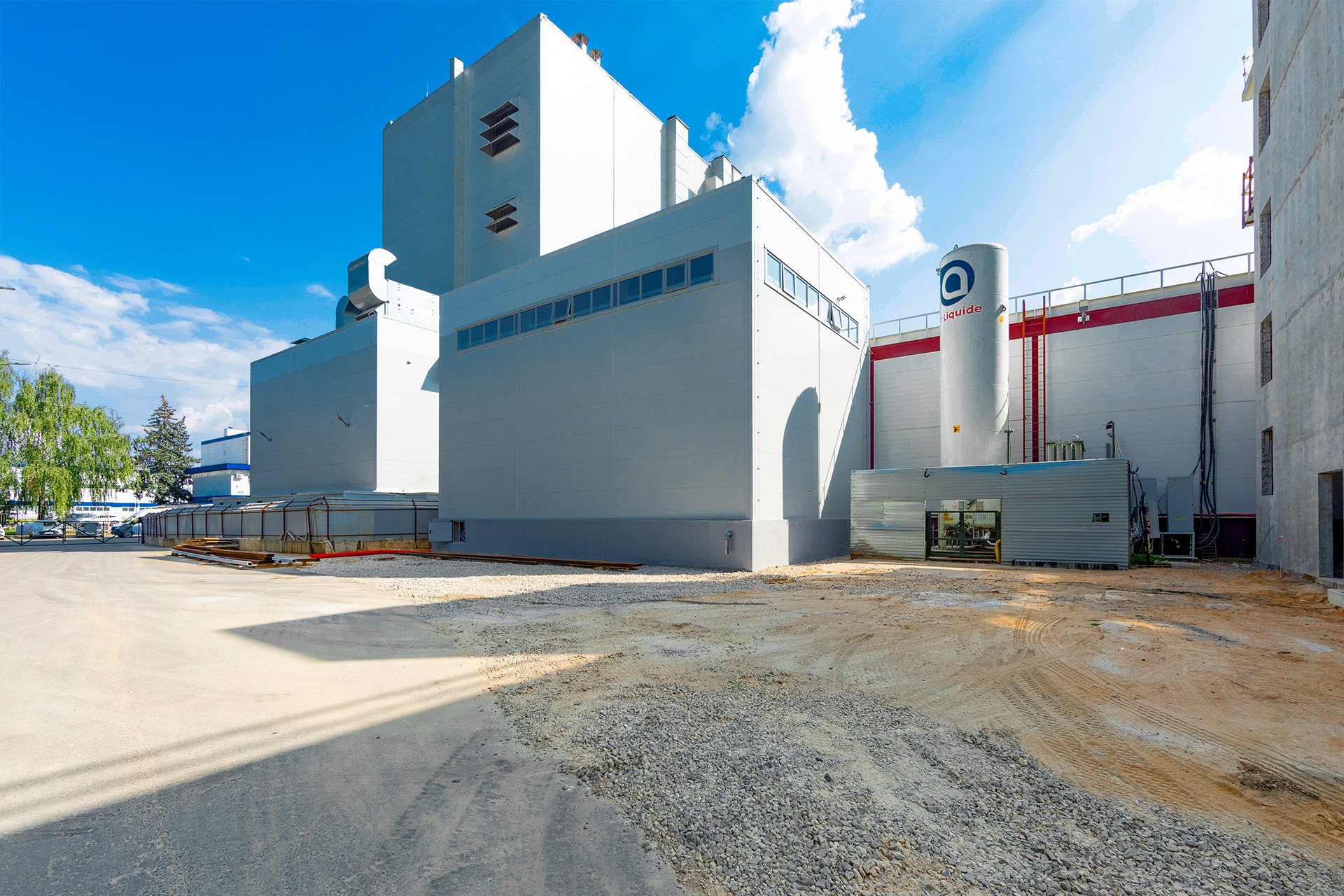 Цех масел: Монтаж систем вентиляции, кондиционирования, отопления и АУПТ. Окраска цоколя. Устройство асфальтового покрытия.