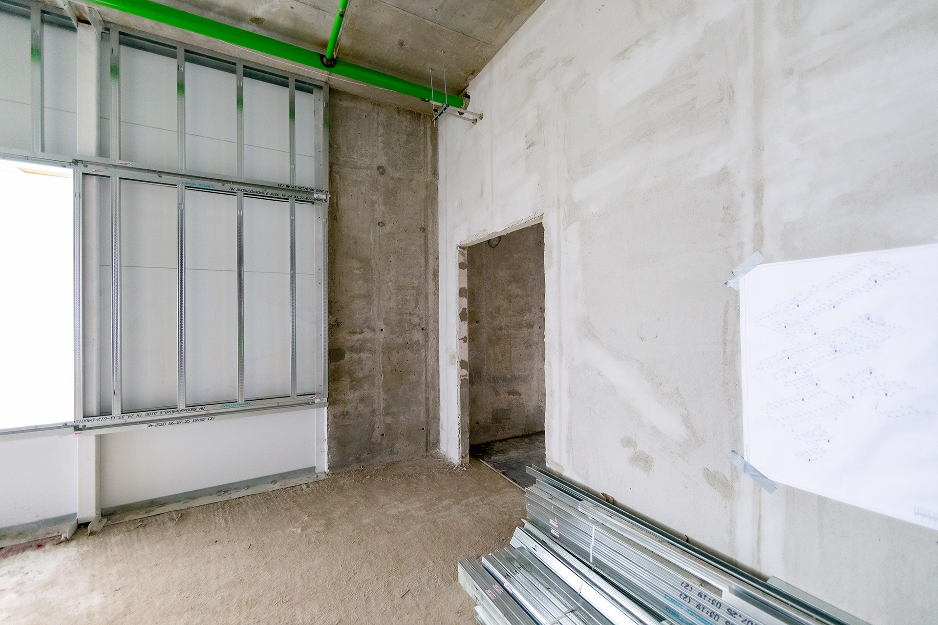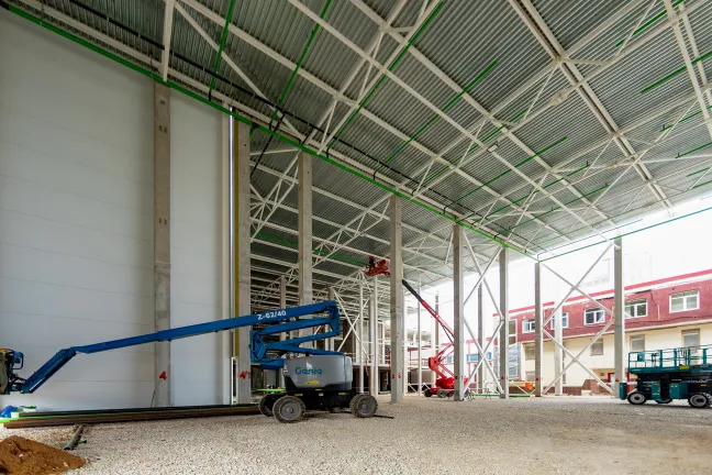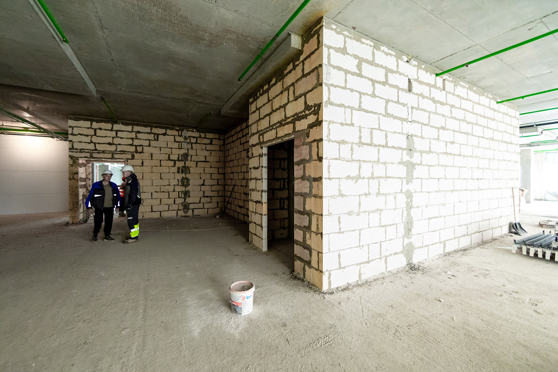 Главное здание: Устройство и оштукатуривание перегородок из пеноблоков. Монтаж сэндвич-панелей и фахверков венткамеры. Сборка и монтаж витражей. Монтаж систем канализации и отопления.