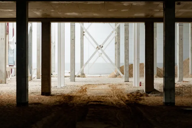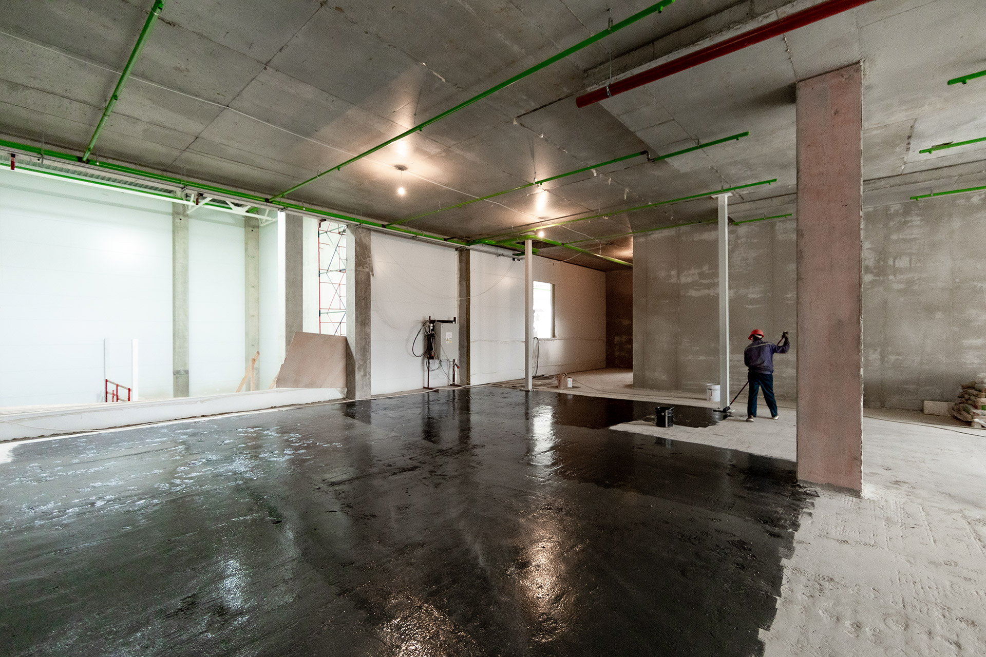 АБЛК: Устройство основания и бетонирование плиты пола. Устройство кровельного пирога, пайка мембраны на кровле и монтаж утеплителя. Монтаж систем АУПТ, вентиляции, отопления и канализации.