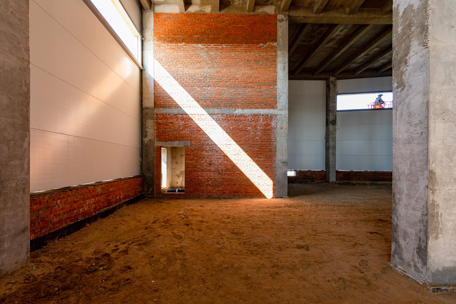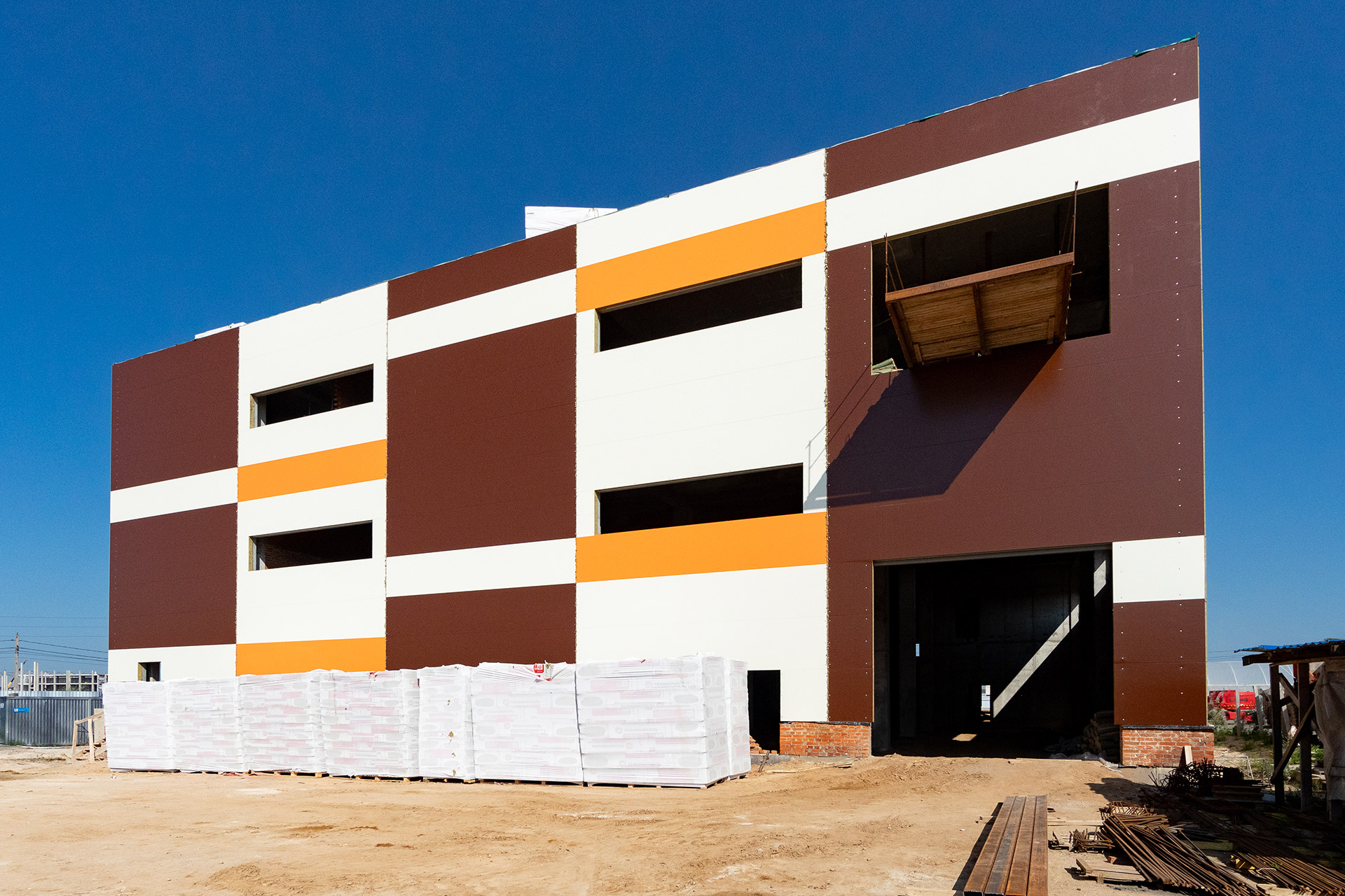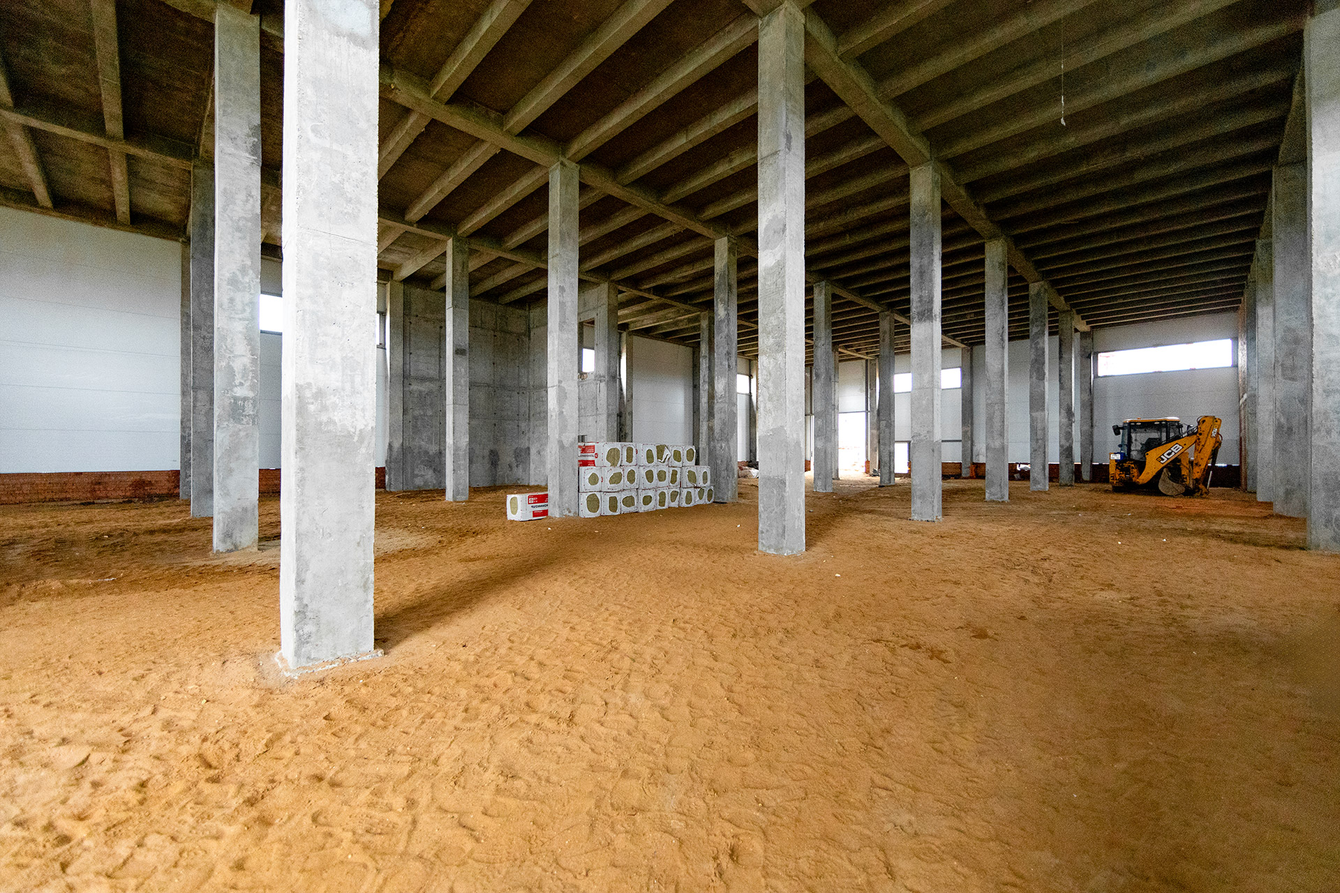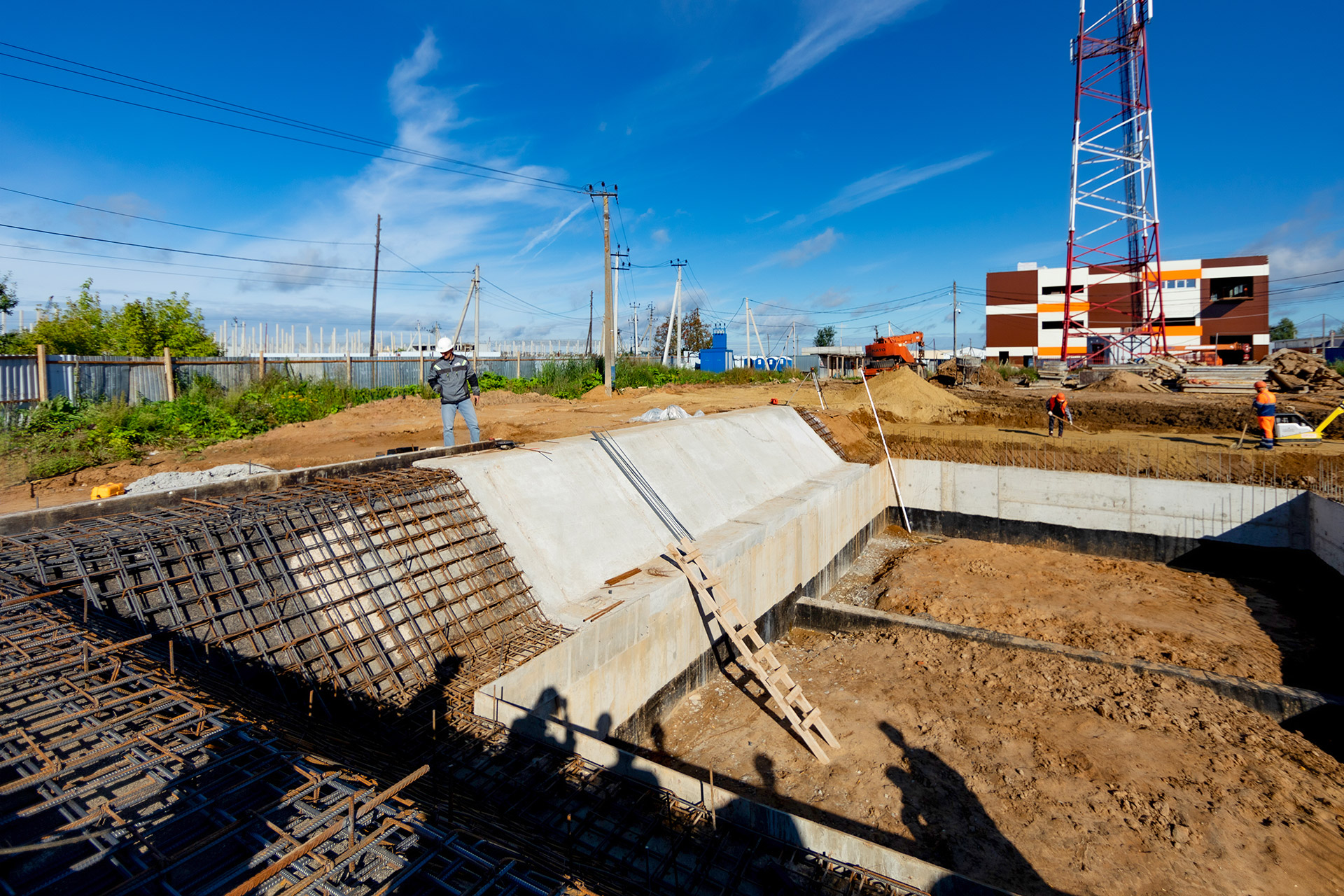Монтаж стеновых сэндвич-панелей и нащельников. Возведение кирпичного парапета. Устройство кровельного пирога. Армирование, бетонирование и гидроизоляция подпорных стен пруда. Разработка котлована под резервуар пожаротушения. Кирпичная кладка стен котельной. Армирование и бетонирование плит пола и перекрытия котельной. Шлифовка бетонных поверхностей стен и перекрытий.