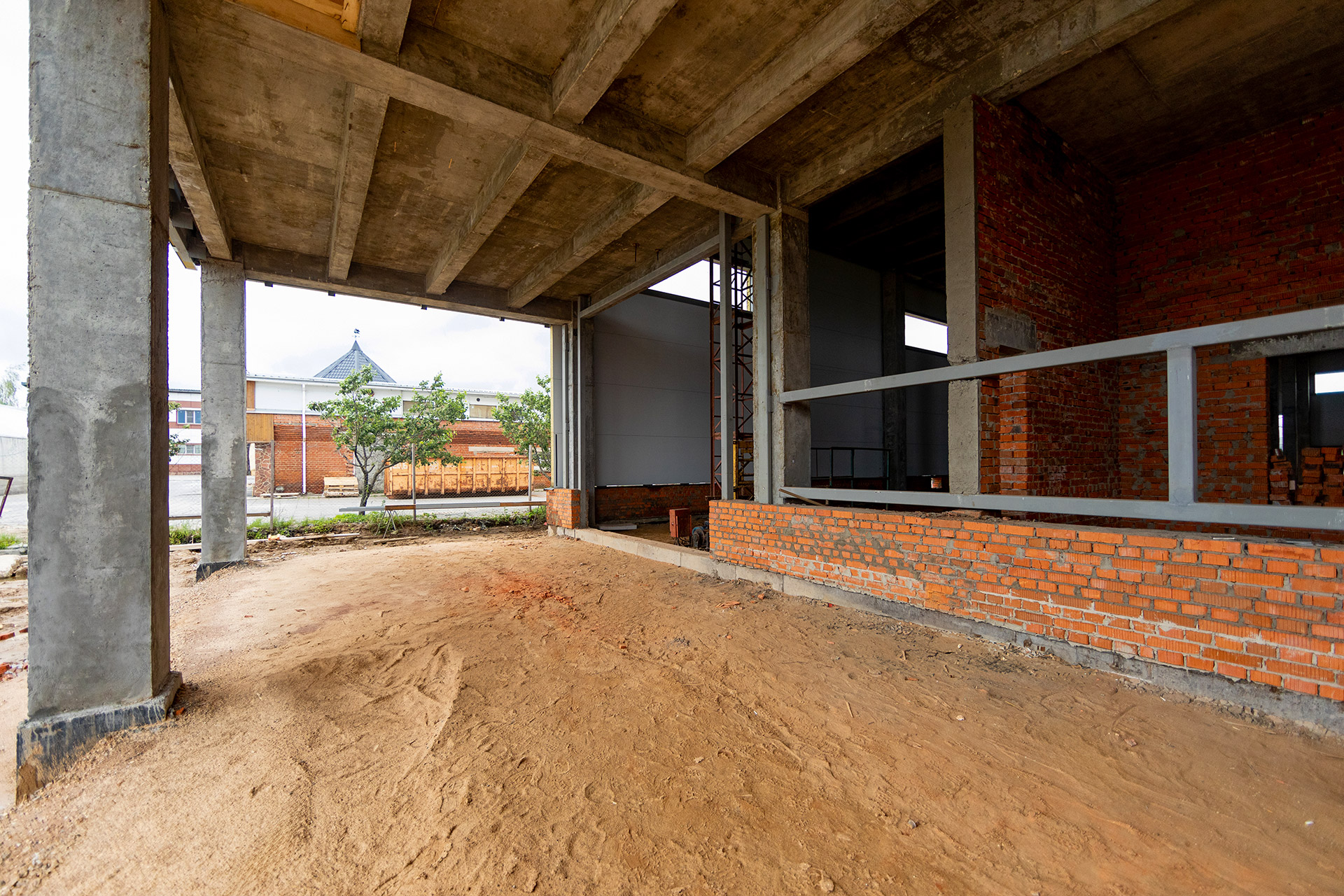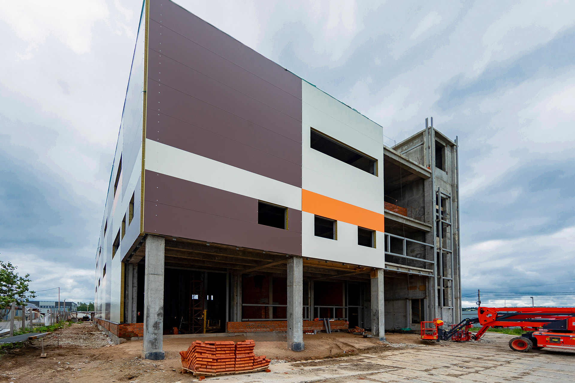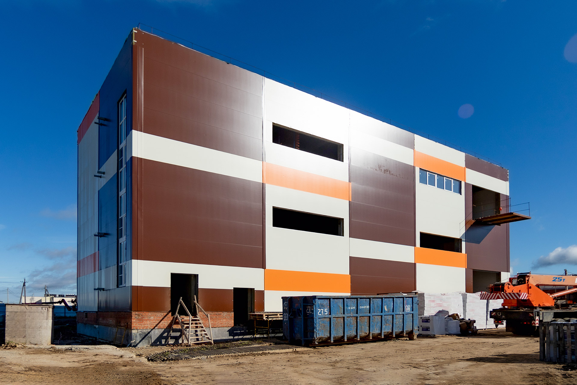Монтаж стеновых сэндвич-панелей и нащельников. Возведение кирпичного парапета. Устройство кровельного пирога. Армирование, бетонирование и гидроизоляция подпорных стен пруда. Разработка котлована под резервуар пожаротушения. Кирпичная кладка стен котельной. Армирование и бетонирование плит пола и перекрытия котельной. Шлифовка бетонных поверхностей стен и перекрытий.