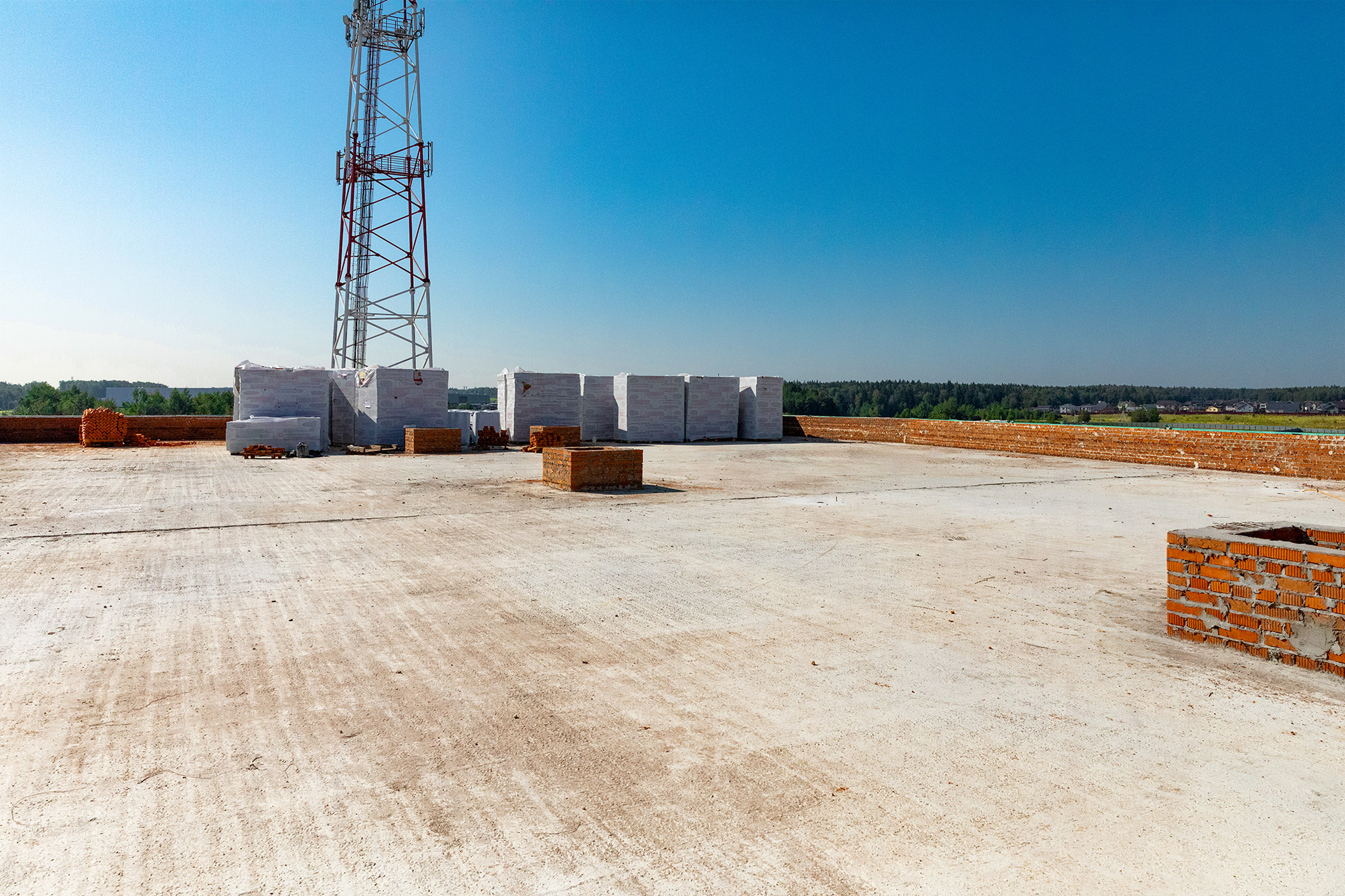 Возведение стен из газоблоков. Устройство кровли. Подготовка песчаного основания под плиту пола. Утепление балок и плиты перекрытия. Монтаж эвакуационной лестницы. Разработка траншеи под внутриплощадочную канализационную сеть. Устройство и гидроизоляция подбетонки под плиту пожарного резервуара.