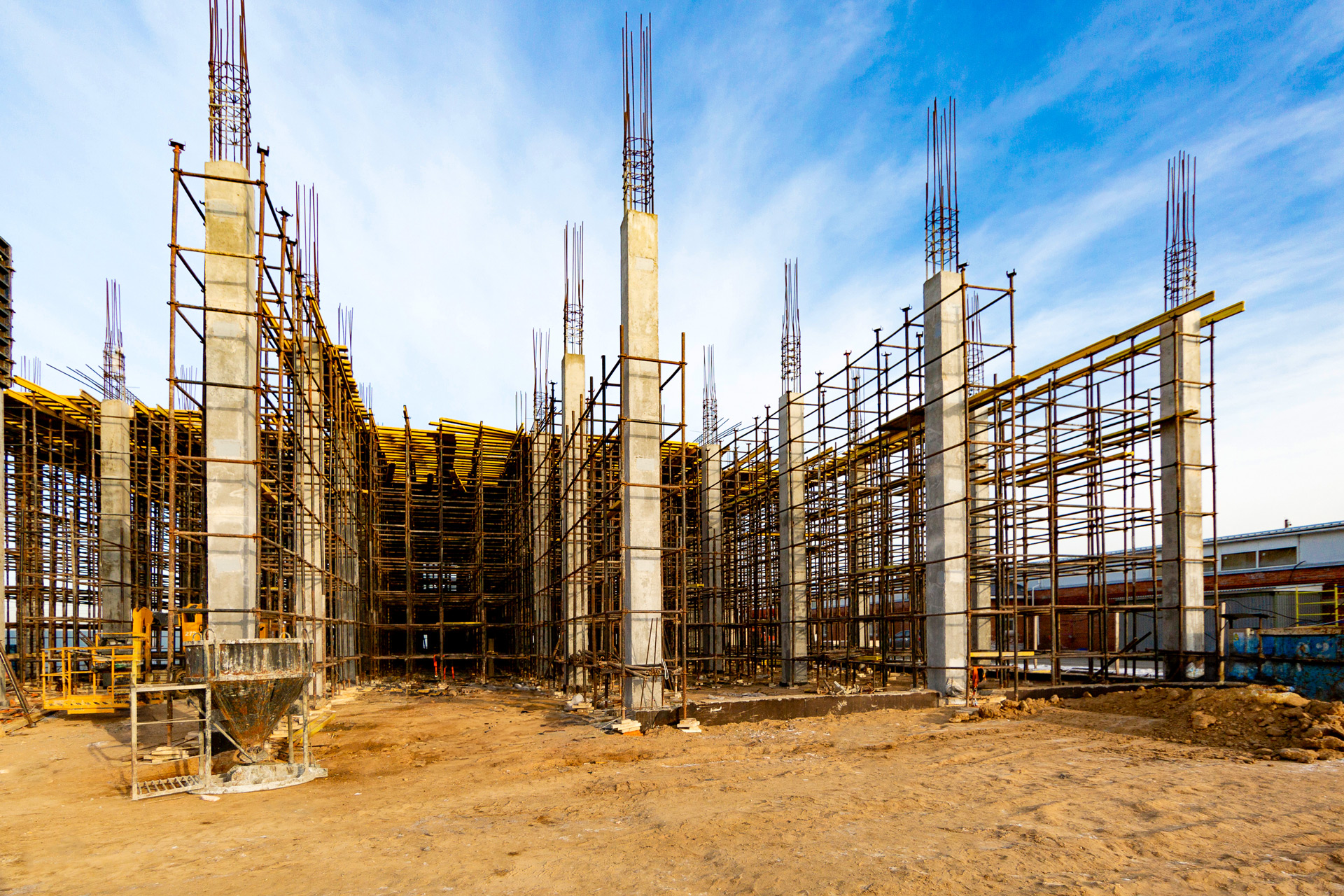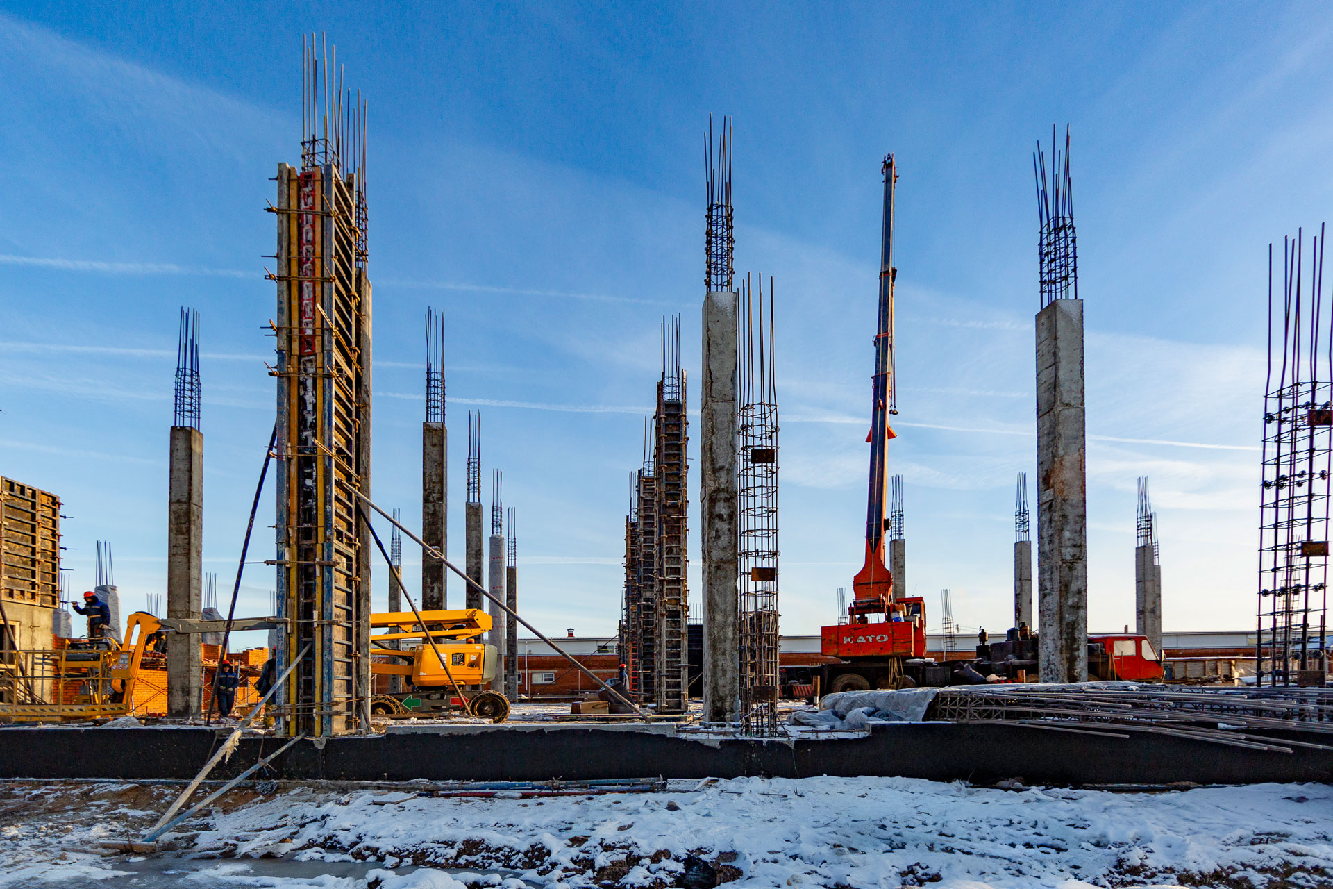 АБК: возведение стен и перегородок 1-го этажа, бетонирование перекрытия второго этажа и лестничной клетки. Складской блок: Бетонирование колонн до отметки 8.000, установка объемных лесов, монтаж опалубки, армирование и бетонирование балок и плиты перекрытия, армирование колонн с отметки 8.550.