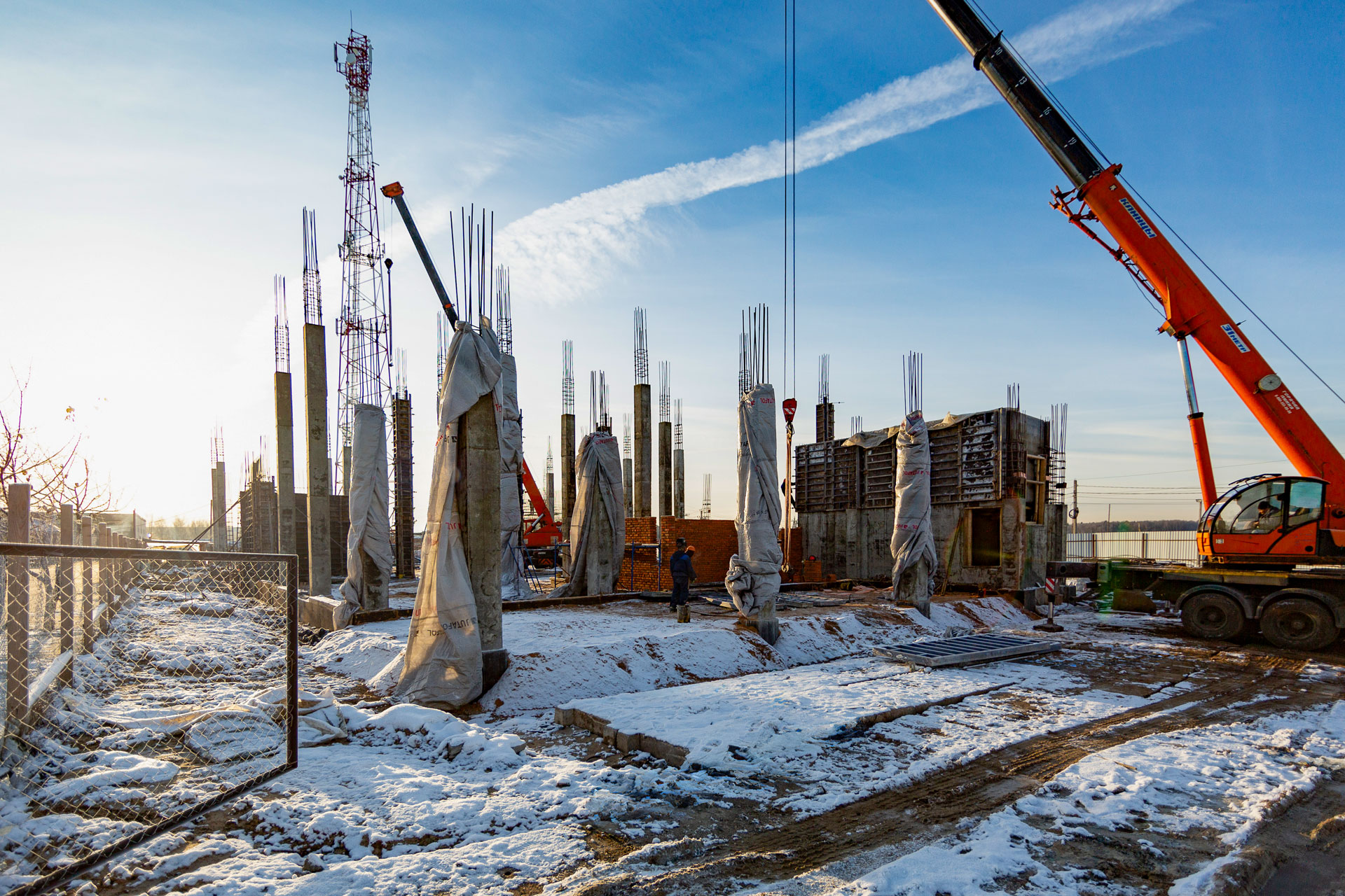 Монтаж стеновых сэндвич-панелей и нащельников. Возведение кирпичного парапета. Устройство кровельного пирога. Армирование, бетонирование и гидроизоляция подпорных стен пруда. Разработка котлована под резервуар пожаротушения. Кирпичная кладка стен котельной. Армирование и бетонирование плит пола и перекрытия котельной. Шлифовка бетонных поверхностей стен и перекрытий.