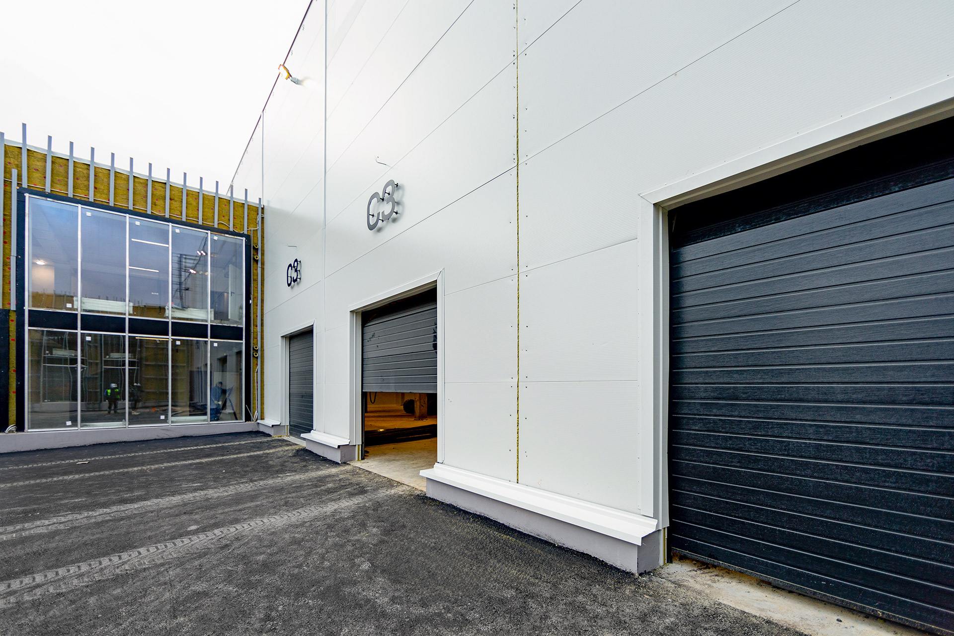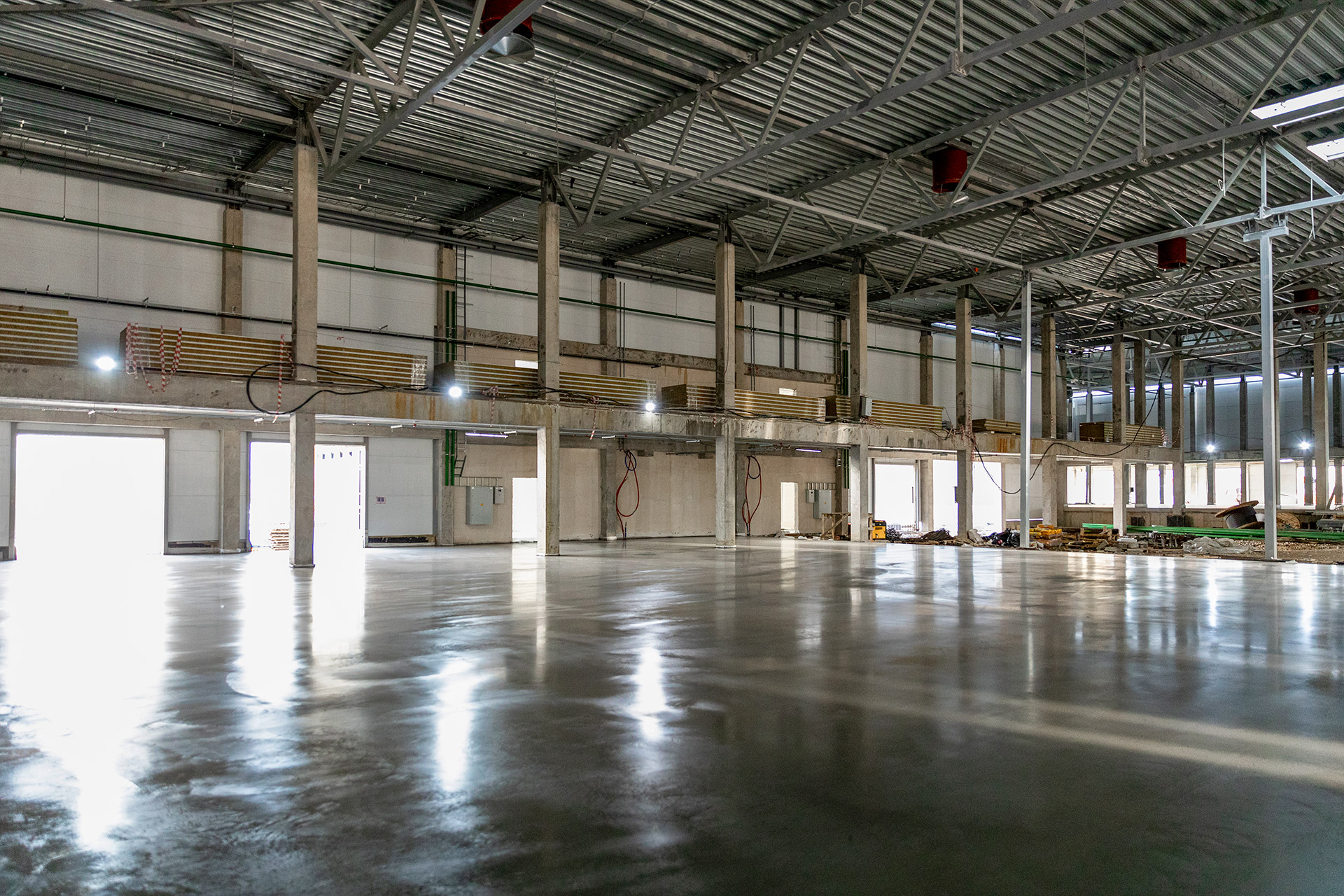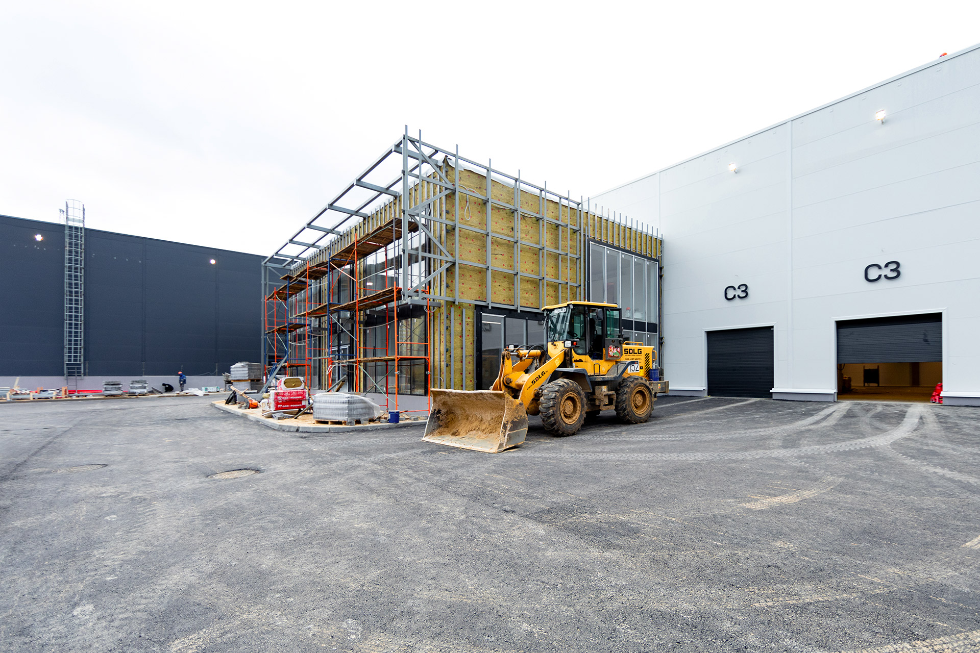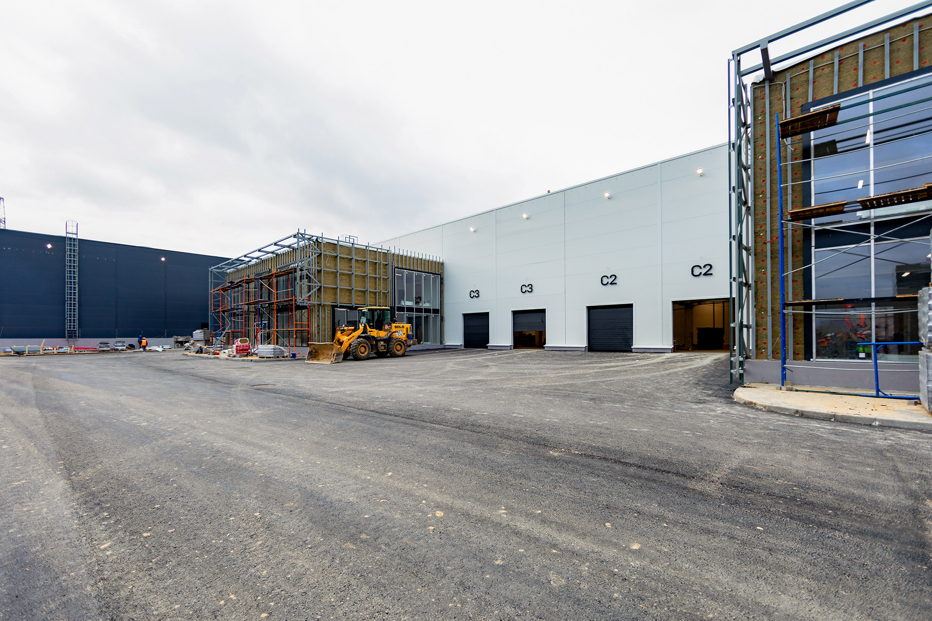 Блоки А Б С: Бетонирование плит пола, стяжки пола мезонинов, цокольной стены и оснований под доквеллеры. Монтаж металлоконструкций фасадов, сэндвич-панелей, ворот и витражей. Огнезащита на металлоконструкций. Устройство кровли. Возведение, штукатурка и шпаклевка газобетонных стен, укладка плитки. Монтаж систем отопления, водоснабжения, электроснабжения, освещения, канализации.