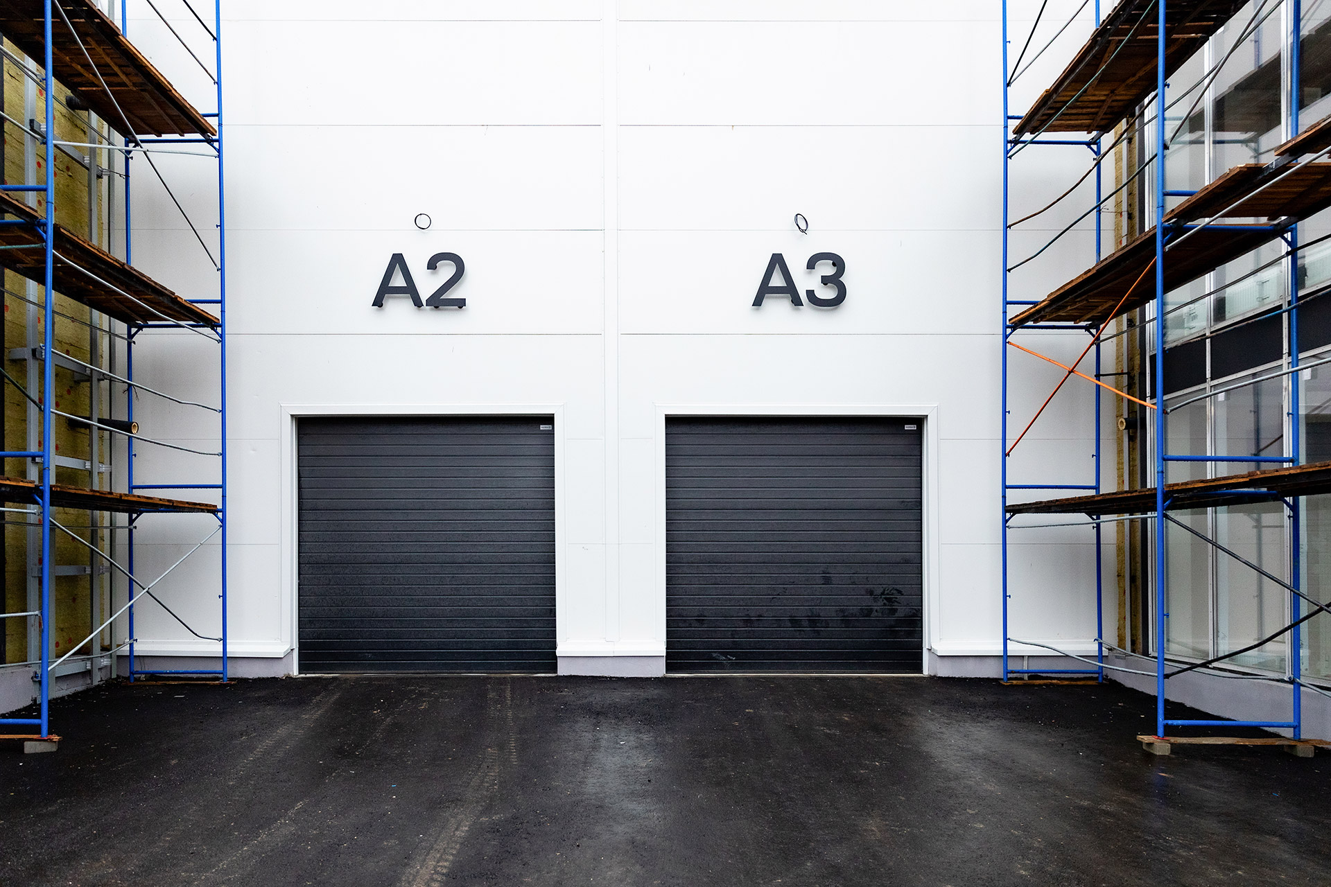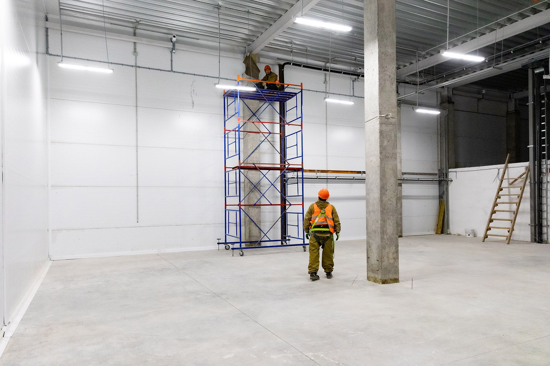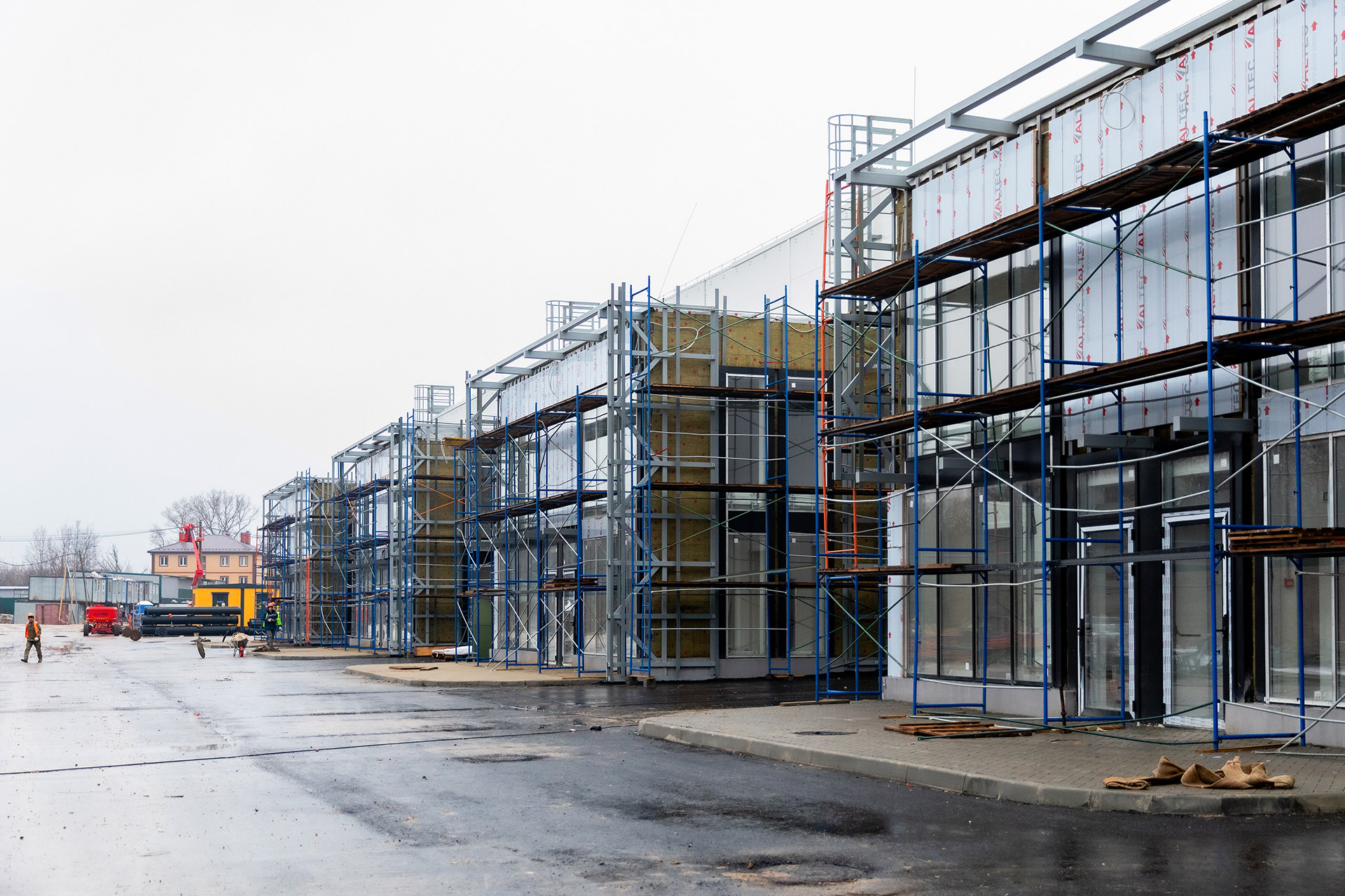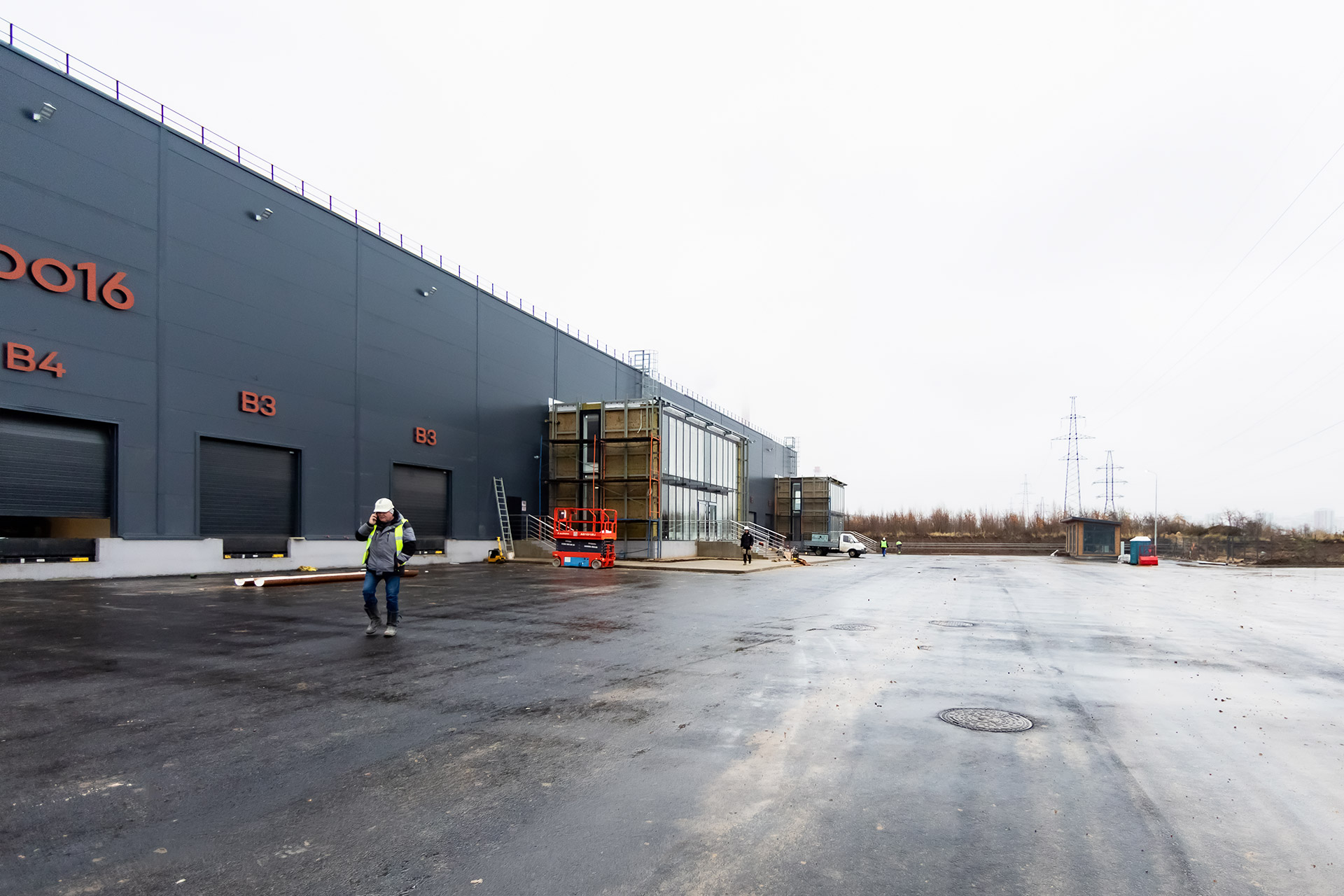 Блоки А Б С: Бетонирование плит пола, стяжки пола мезонинов, цокольной стены и оснований под доквеллеры. Монтаж металлоконструкций фасадов, сэндвич-панелей, ворот и витражей. Огнезащита на металлоконструкций. Устройство кровли. Возведение, штукатурка и шпаклевка газобетонных стен, укладка плитки. Монтаж систем отопления, водоснабжения, электроснабжения, освещения, канализации.