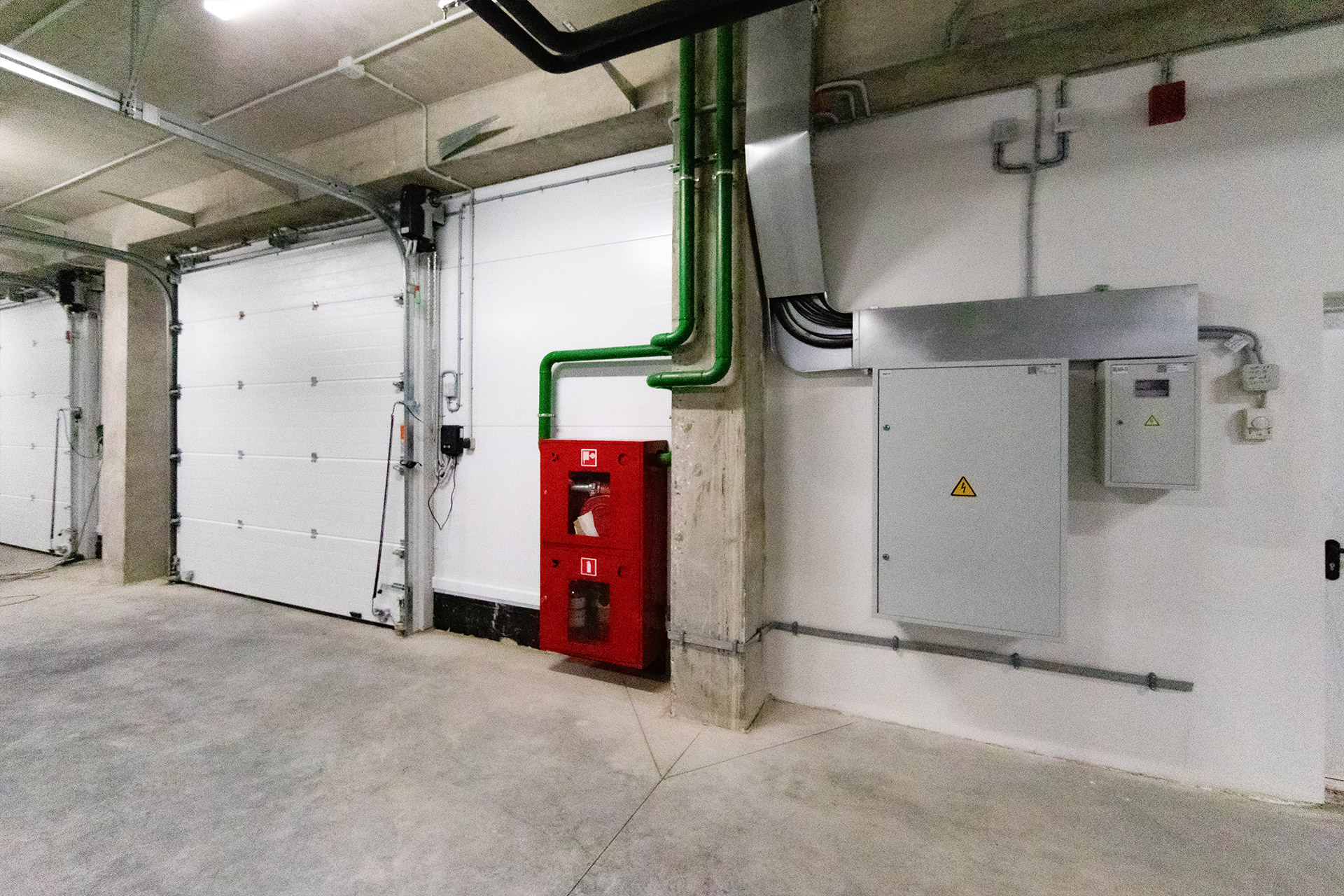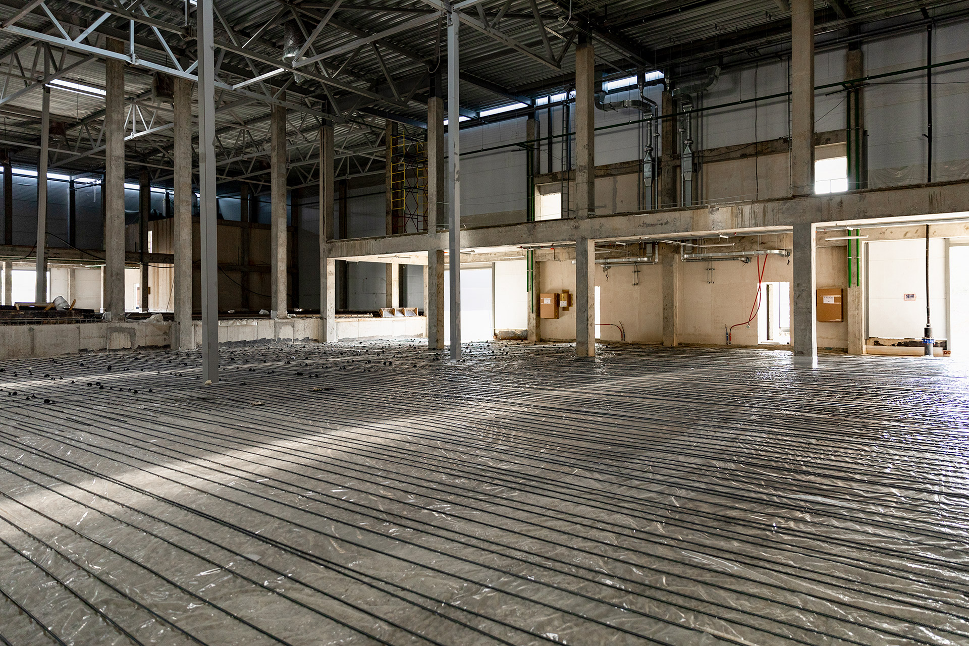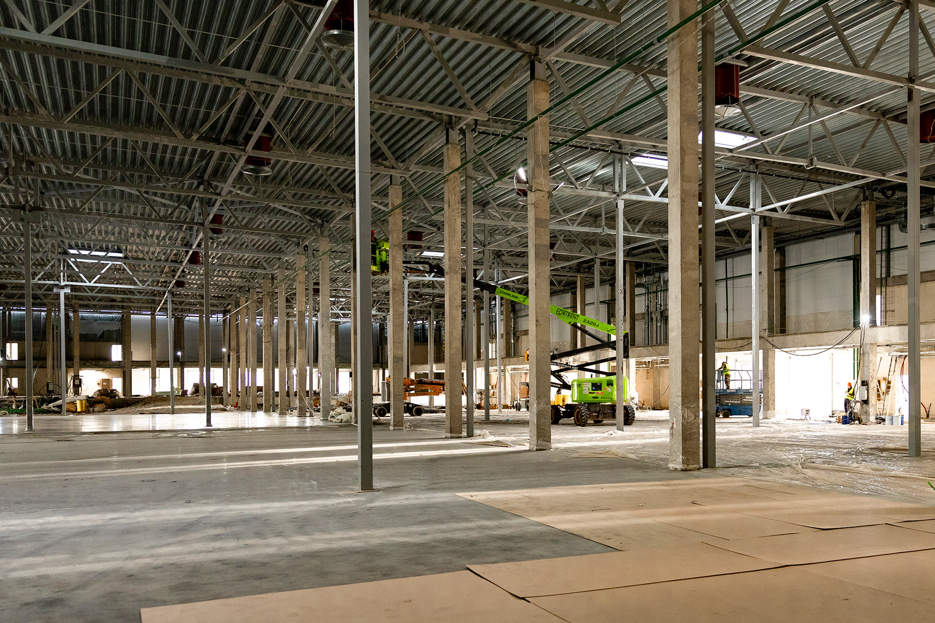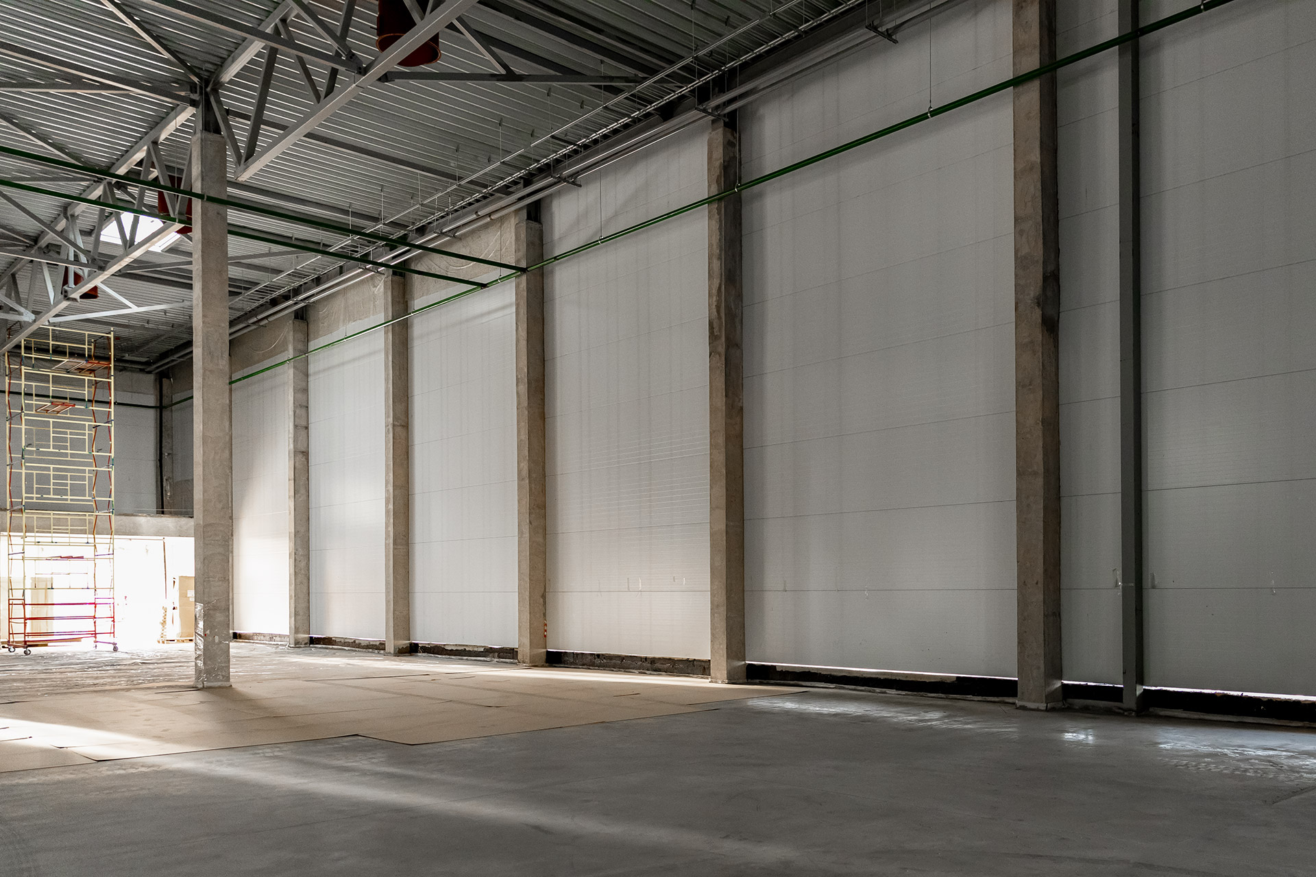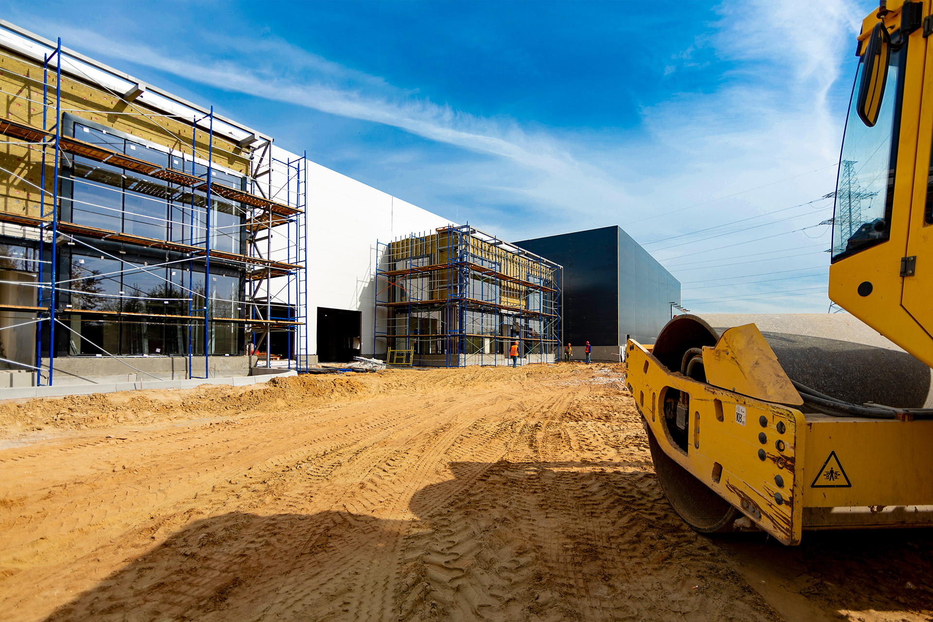 Блоки А Б С: Бетонирование плит пола, стяжки пола мезонинов, цокольной стены и оснований под доквеллеры. Монтаж металлоконструкций фасадов, сэндвич-панелей, ворот и витражей. Огнезащита на металлоконструкций. Устройство кровли. Возведение, штукатурка и шпаклевка газобетонных стен, укладка плитки. Монтаж систем отопления, водоснабжения, электроснабжения, освещения, канализации.