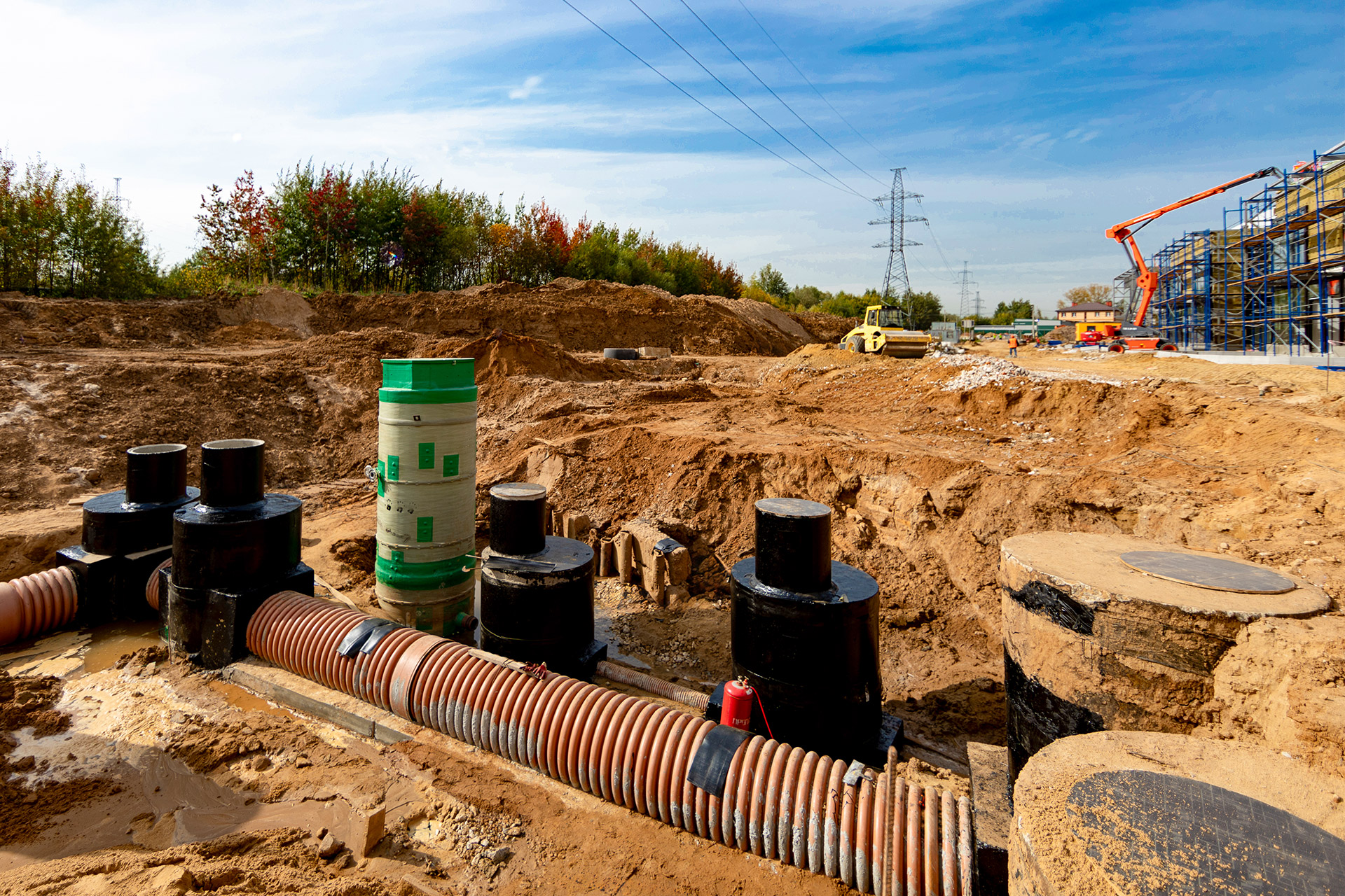 Прочее: Подготовка щебеночного основания под асфальт, устройство дорожных проездов и благоустройство территории. ЛОС: бетонирование плиты, монтаж резервуара, обратная засыпка с уплотнением. Разработка и шпунтование котлована КНС и УФО, подготовка основания и бетонирование плиты пола. Устройство внутриплощадочных канализационных и водопроводных сетей.