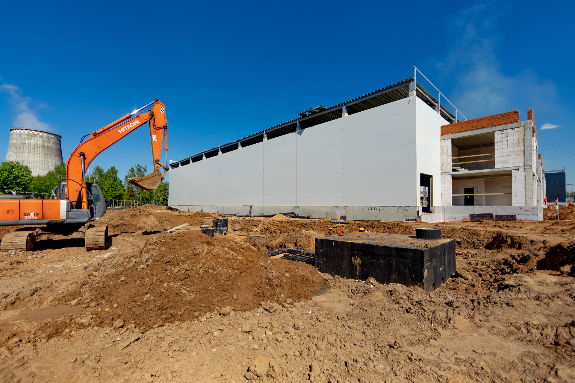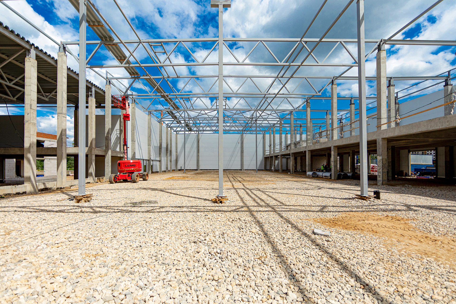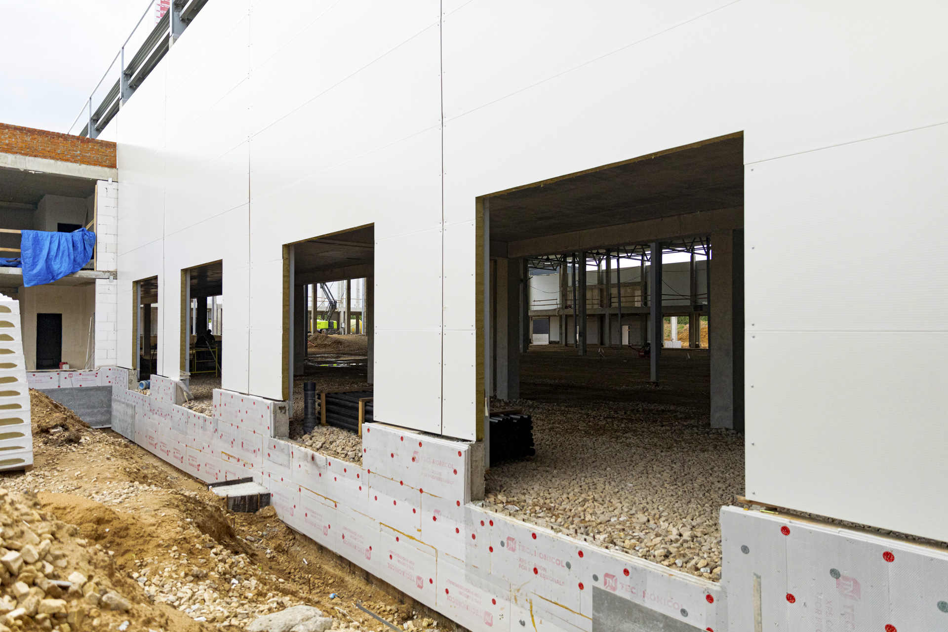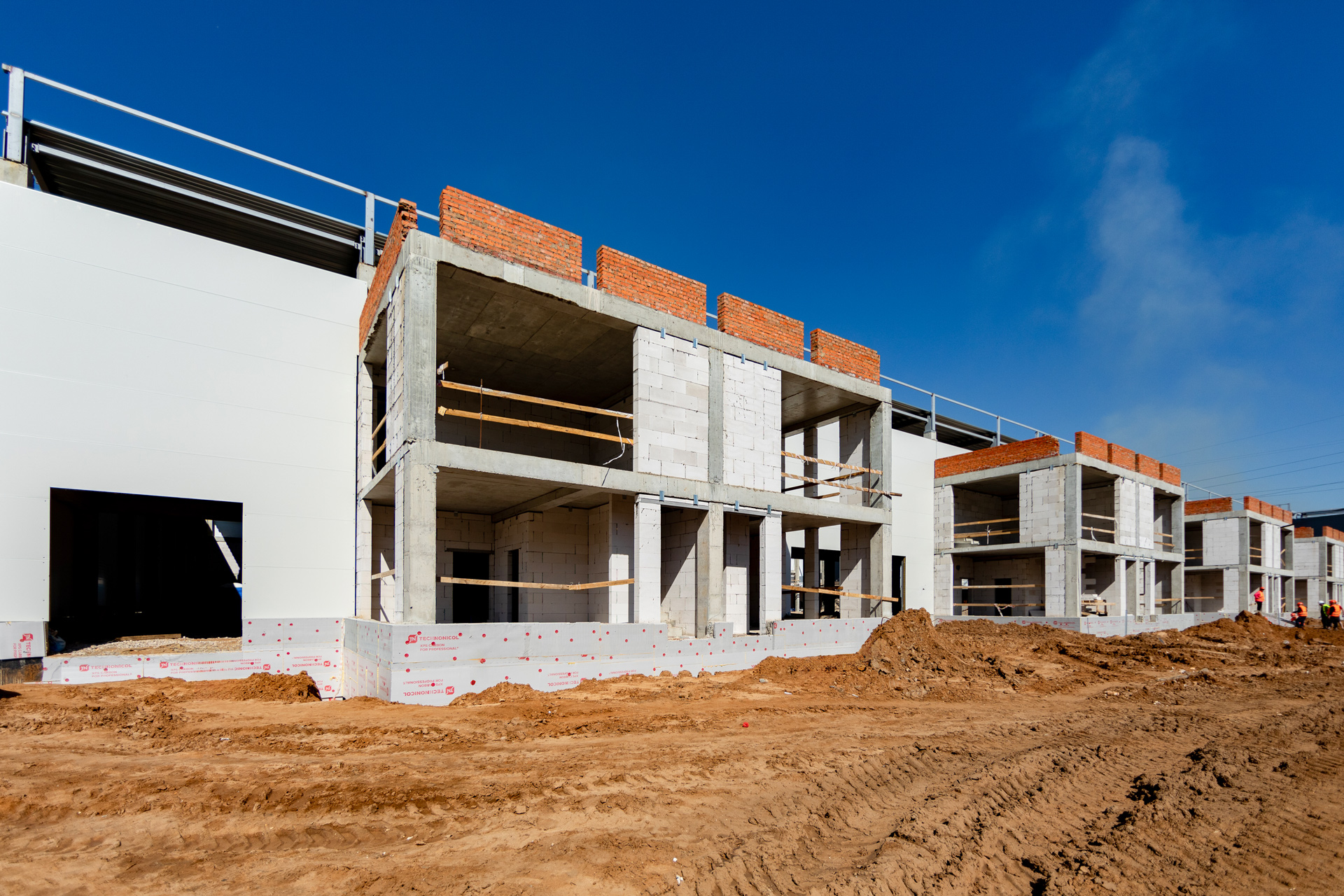 Блоки A, B, C: Утепление цоколя. Бетонирование и шлифовка колонн. Монтаж металлоконструкций, профнастила и сэндвич-панелей. Штукатурка стен. Установка контура заземления. Сварка труб водопровода.