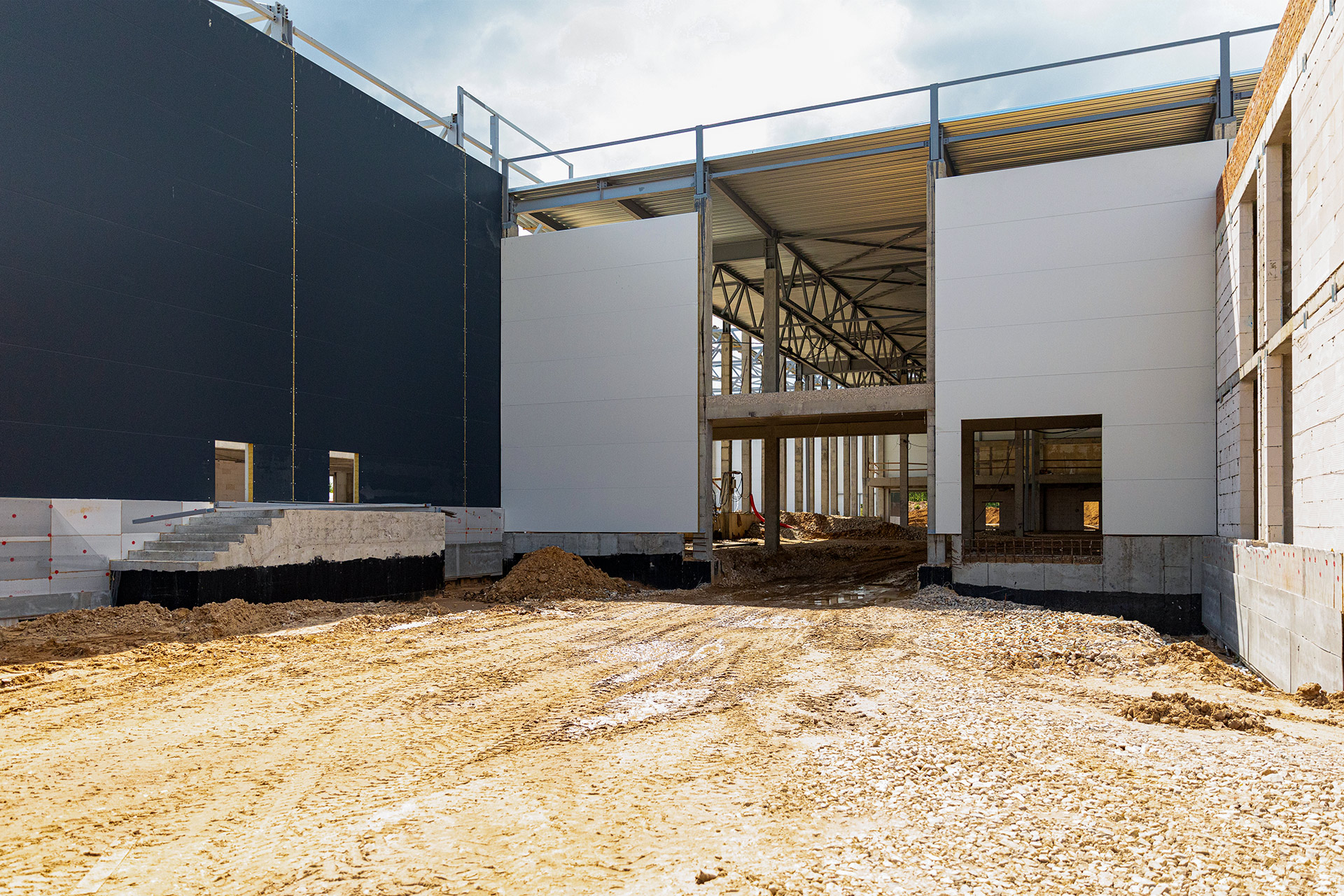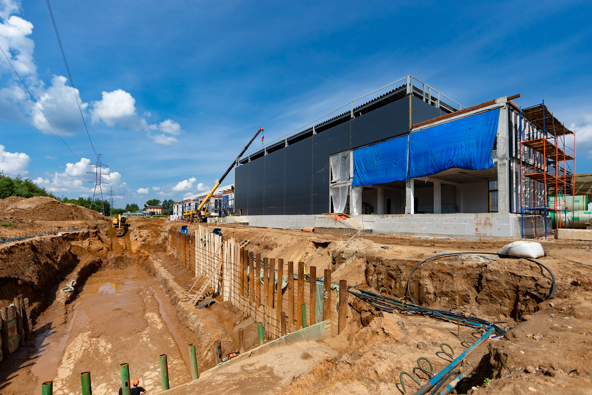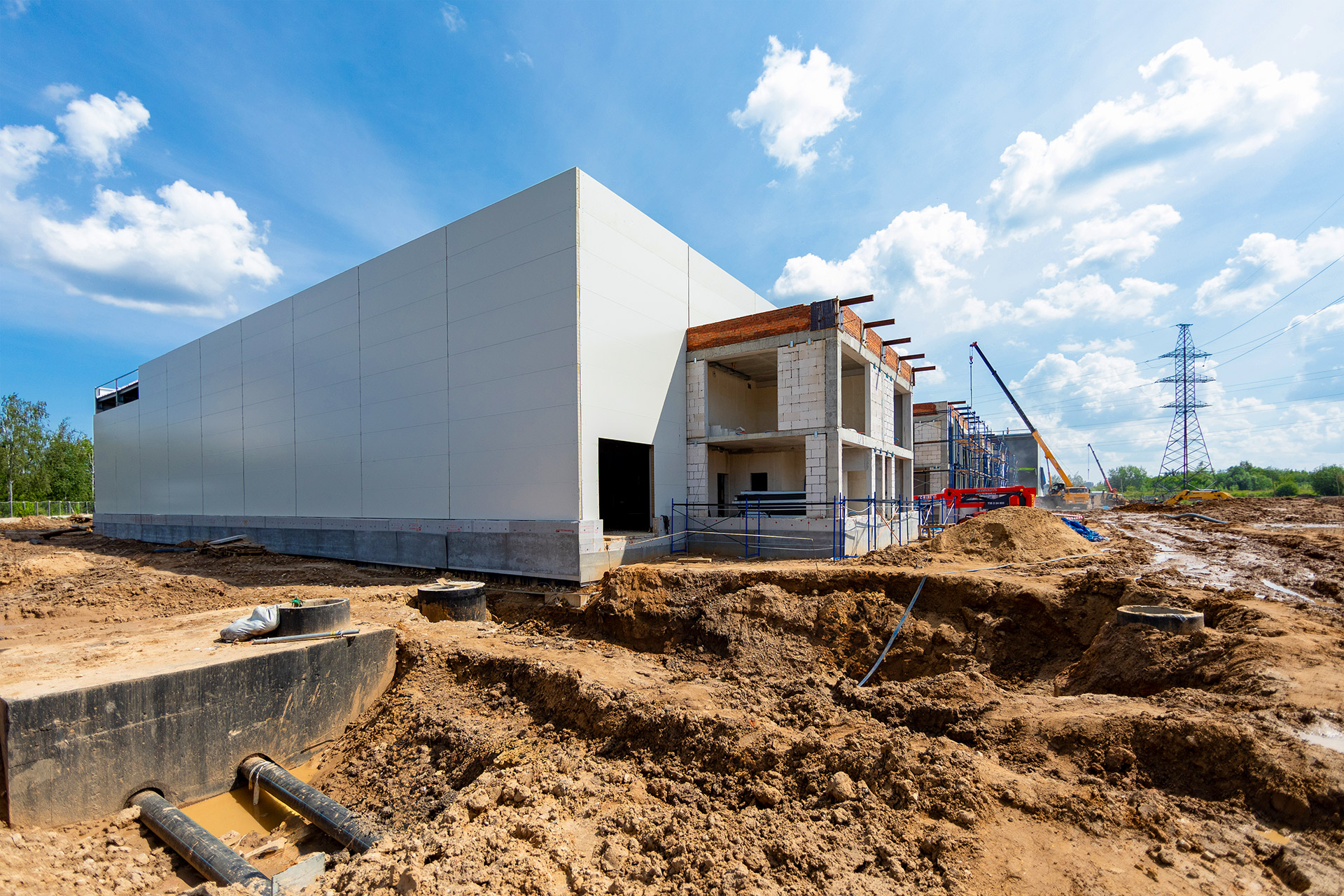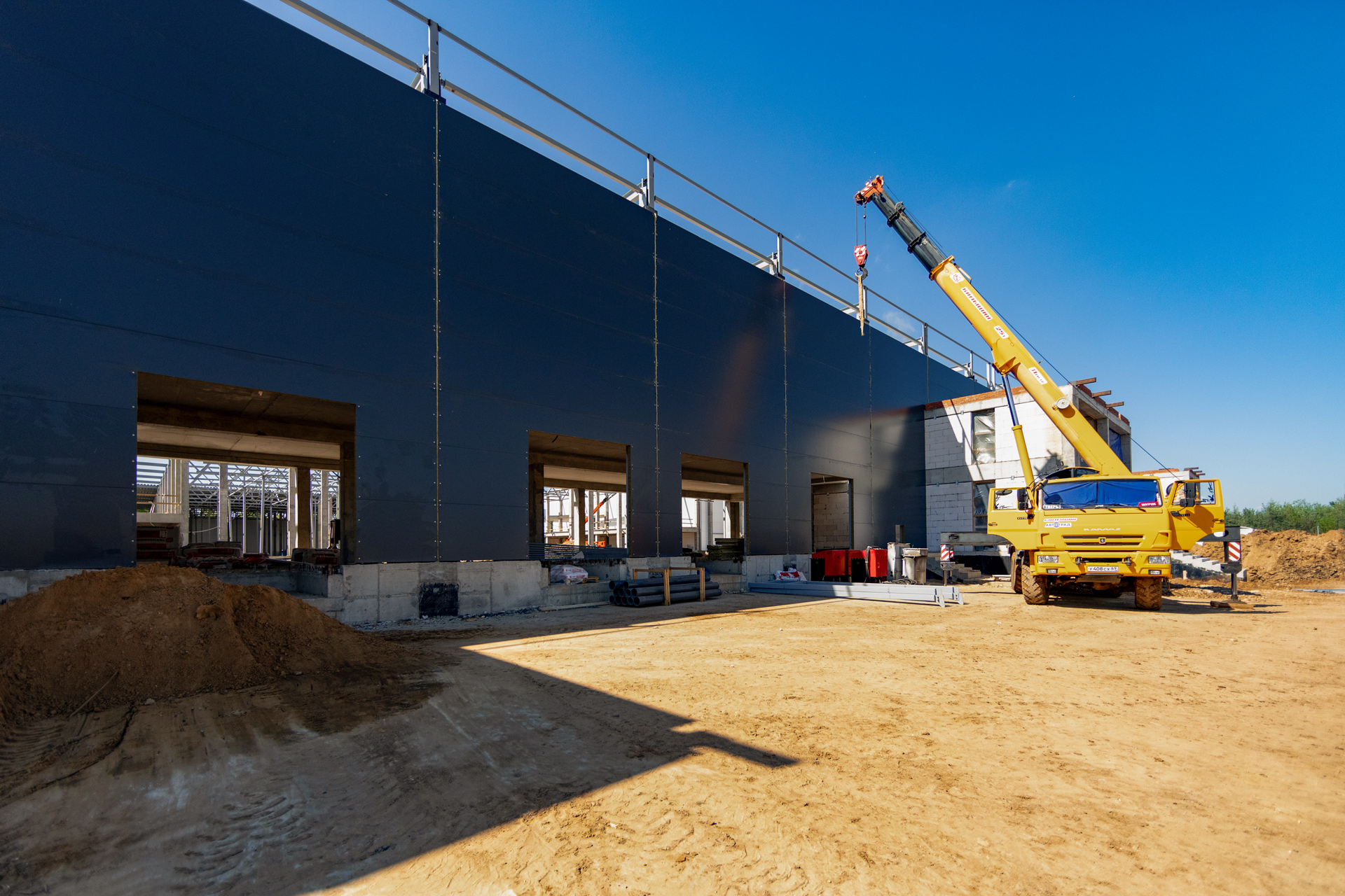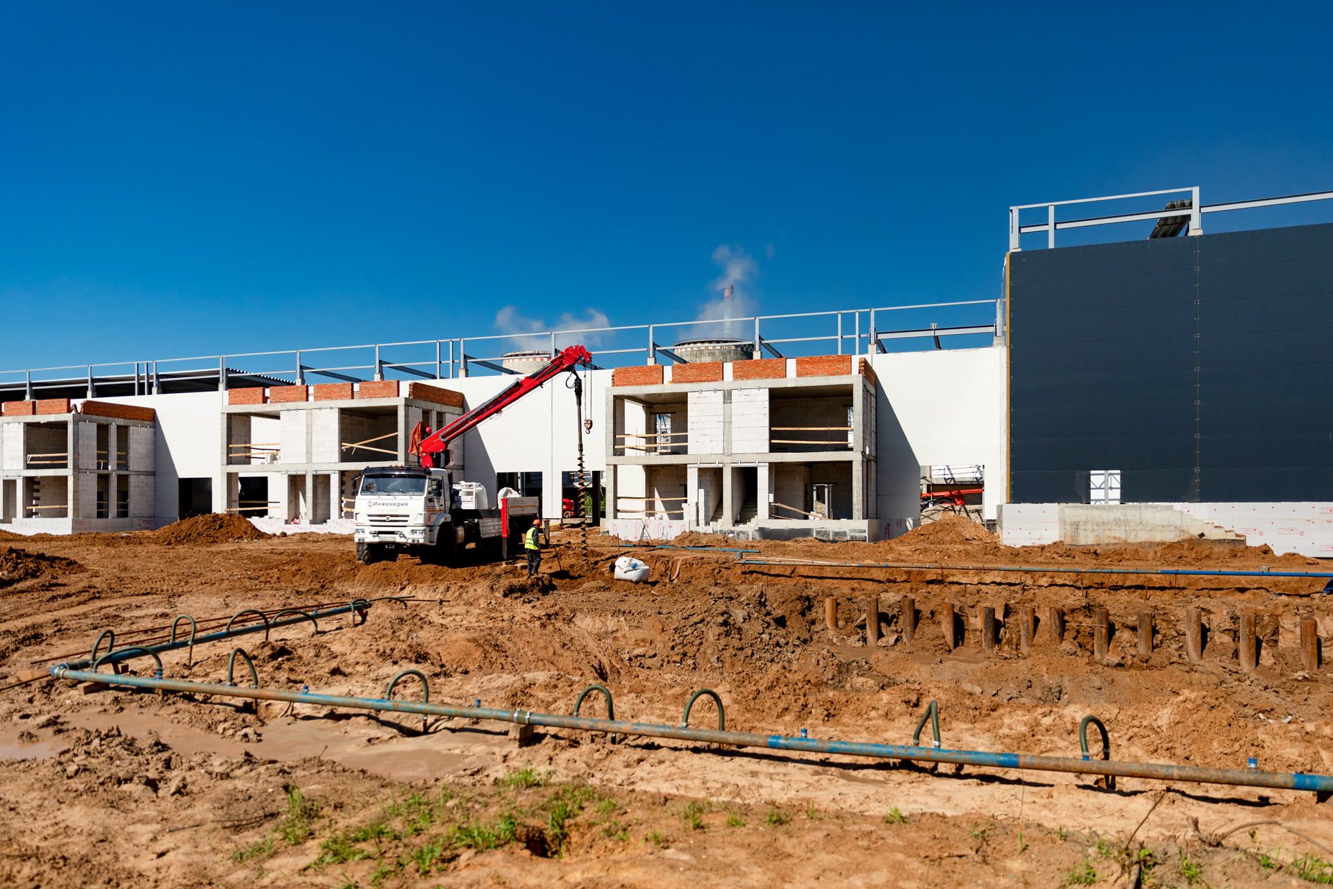 Блоки A, B, C: Утепление цоколя. Бетонирование и шлифовка колонн. Монтаж металлоконструкций, профнастила и сэндвич-панелей. Штукатурка стен. Установка контура заземления. Сварка труб водопровода.