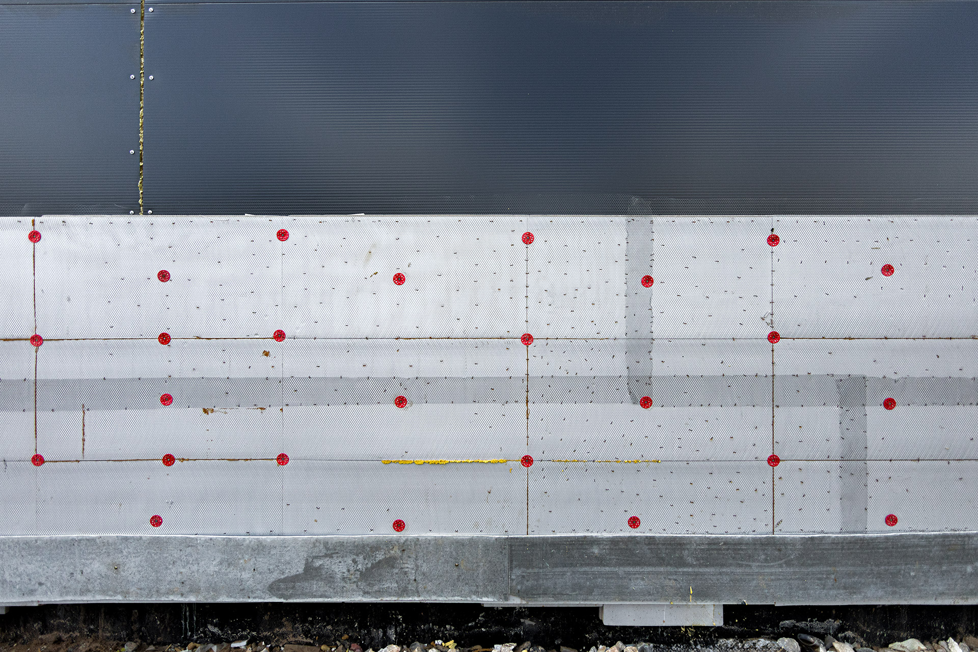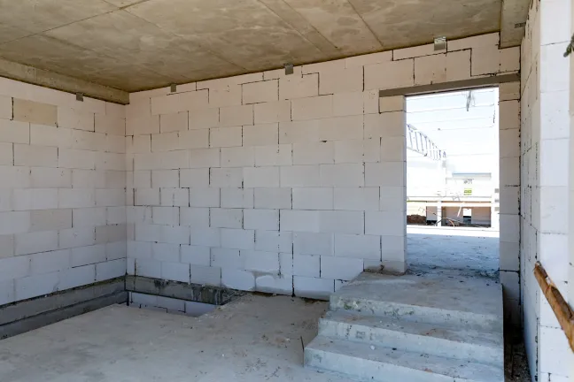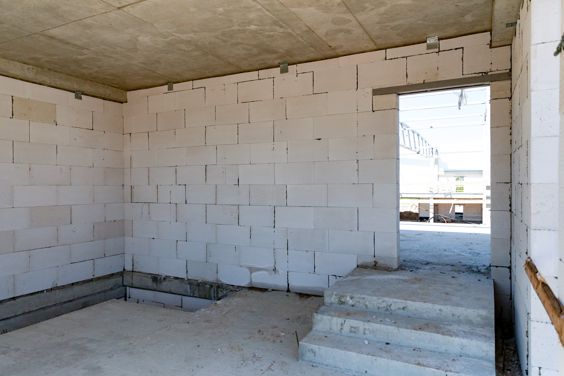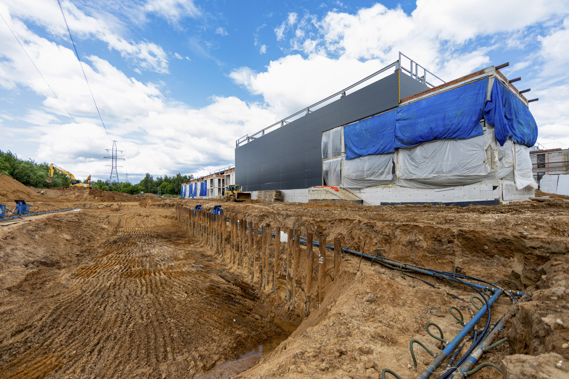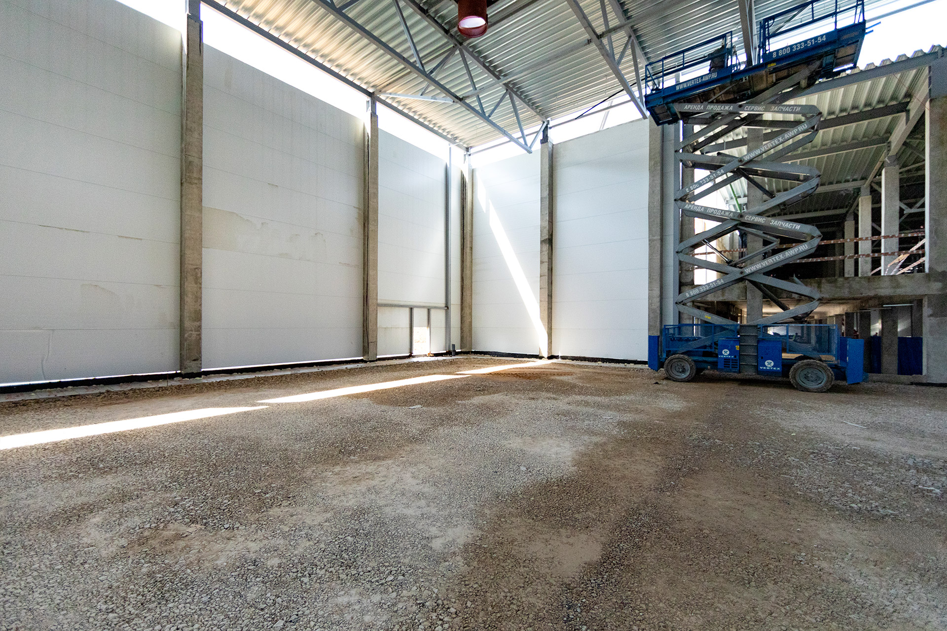 Блоки A, B, C: Утепление цоколя. Бетонирование и шлифовка колонн. Монтаж металлоконструкций, профнастила и сэндвич-панелей. Штукатурка стен. Установка контура заземления. Сварка труб водопровода.