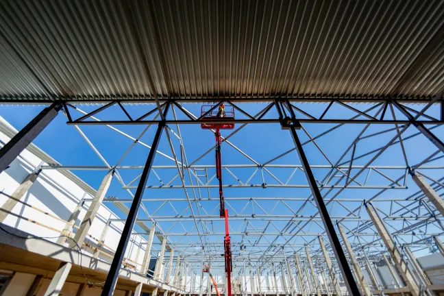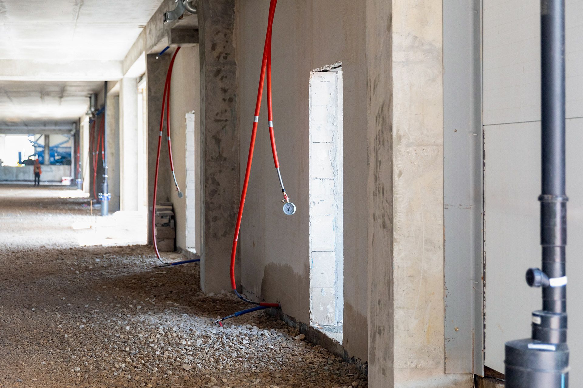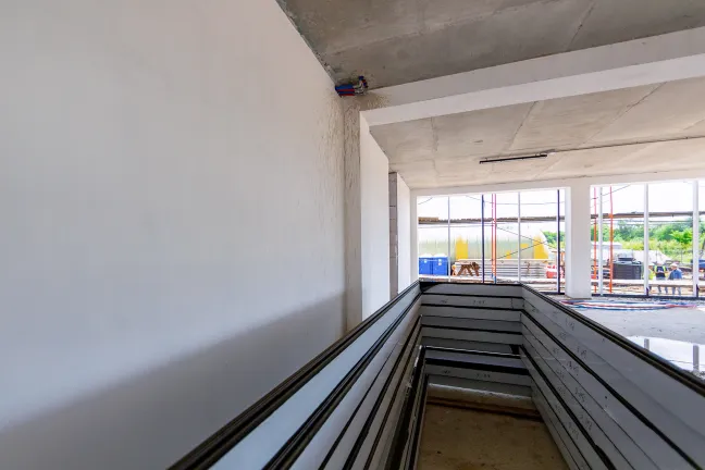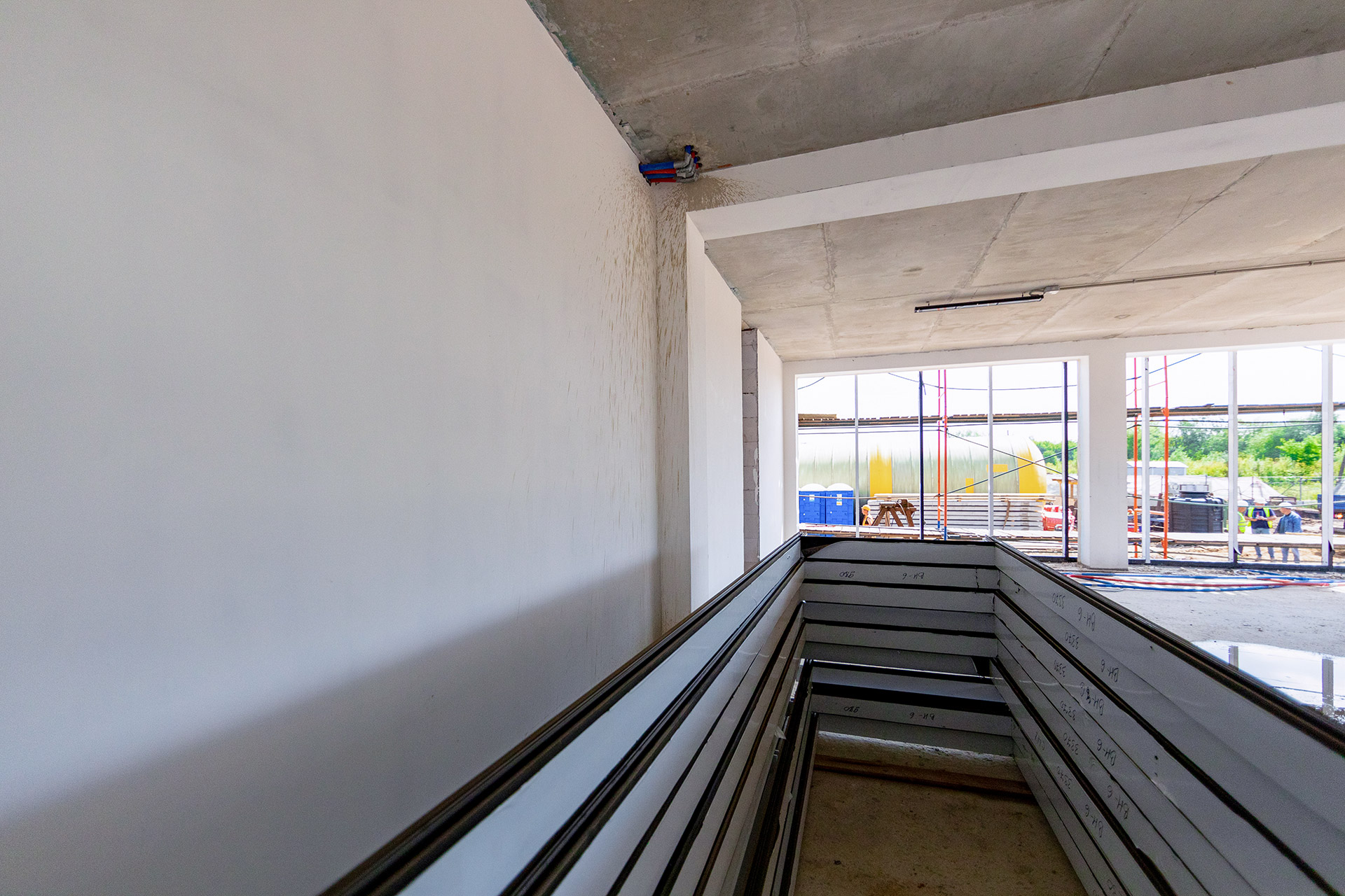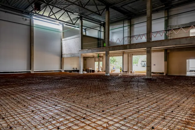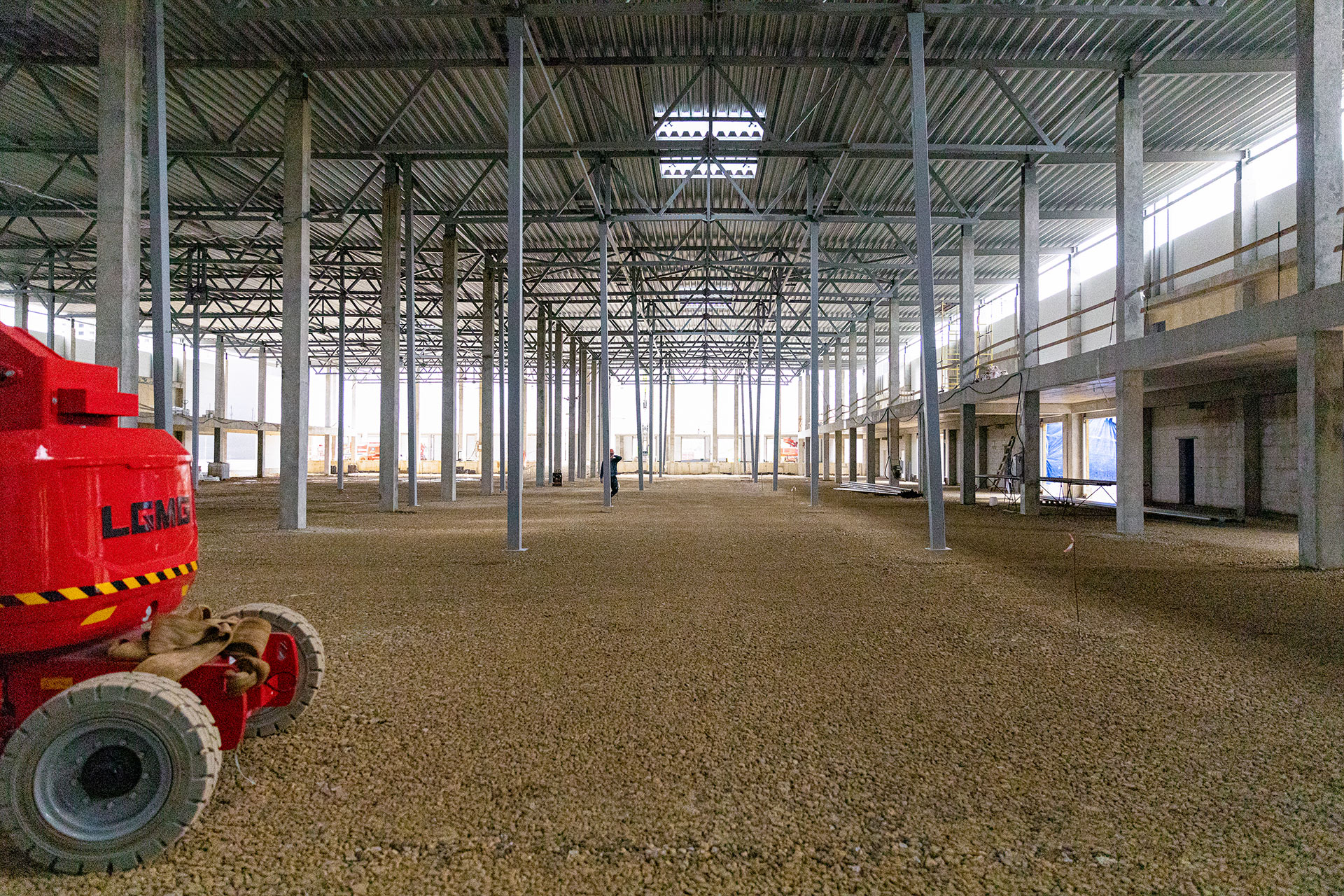 Блоки А Б С: Бетонирование плиты пола. Устройство стяжки. Монтаж люков дымоудаления, труб пожарного водопровода, отопления и водоснабжения. Монтаж систем вентиляции и электроснабжения. Устройство кровельного пирога. Монтаж фасадных и витражных металлоконструкций, утеплителя и сэндвич-панелей. Штукатурка фасадных балок и колонн.
