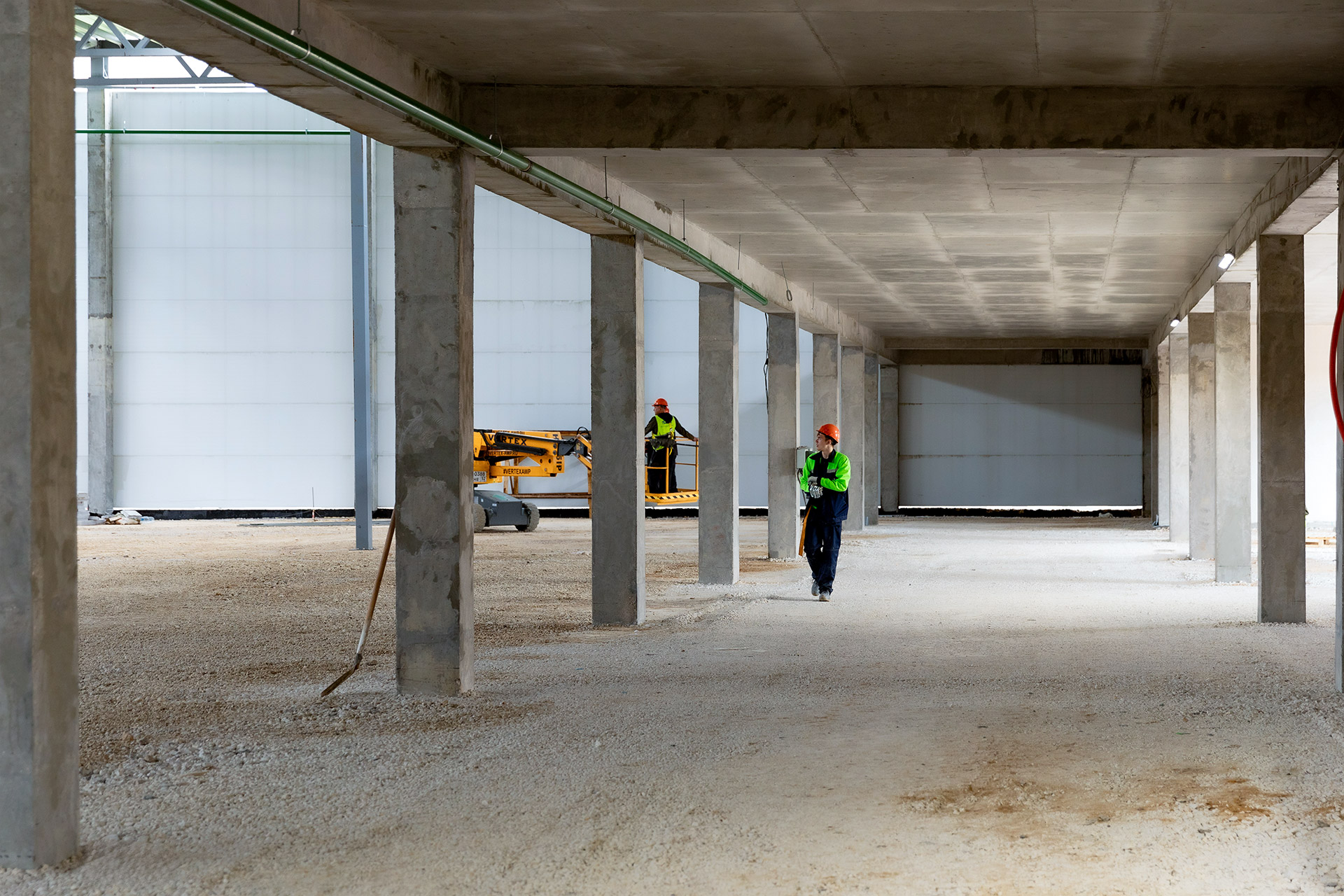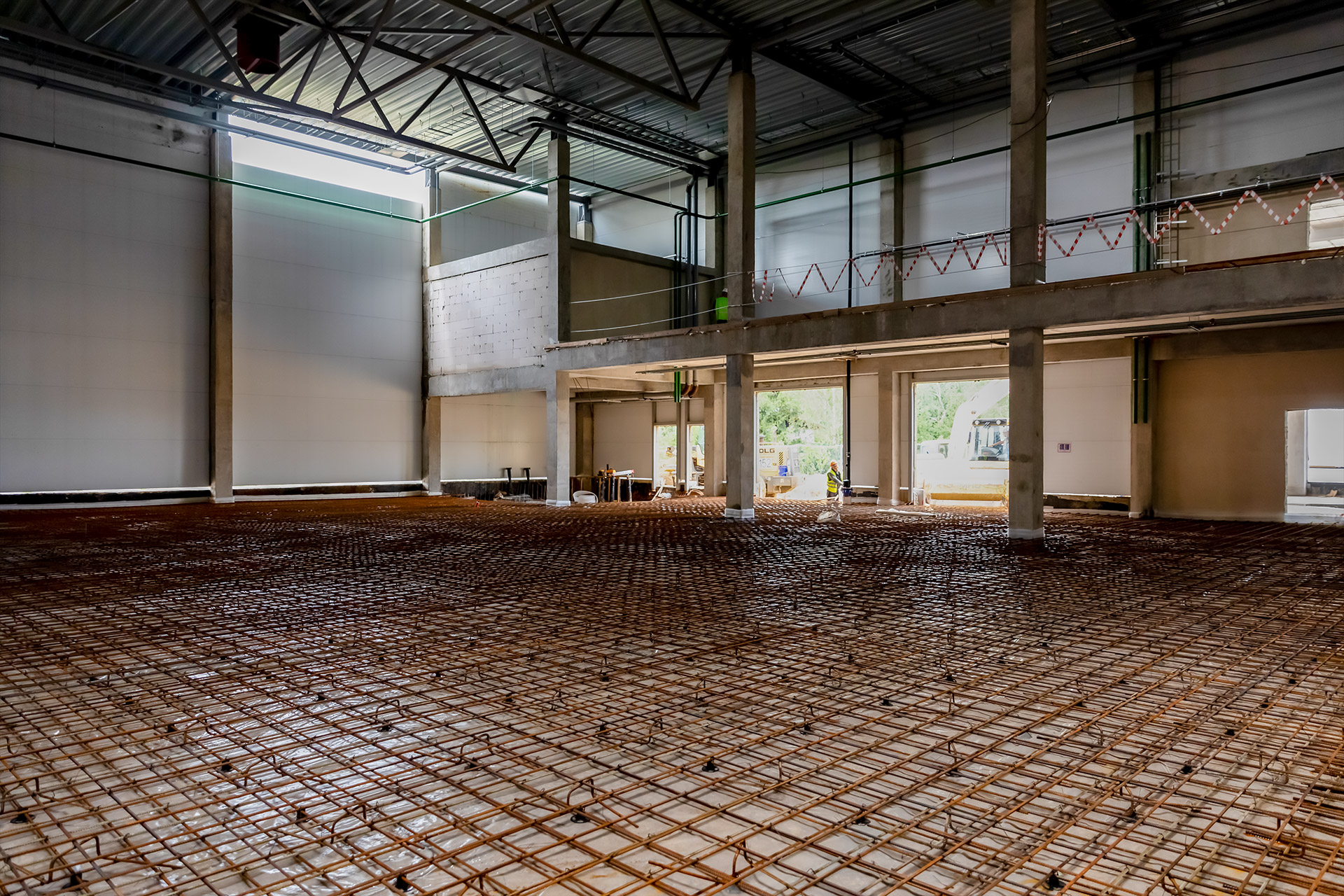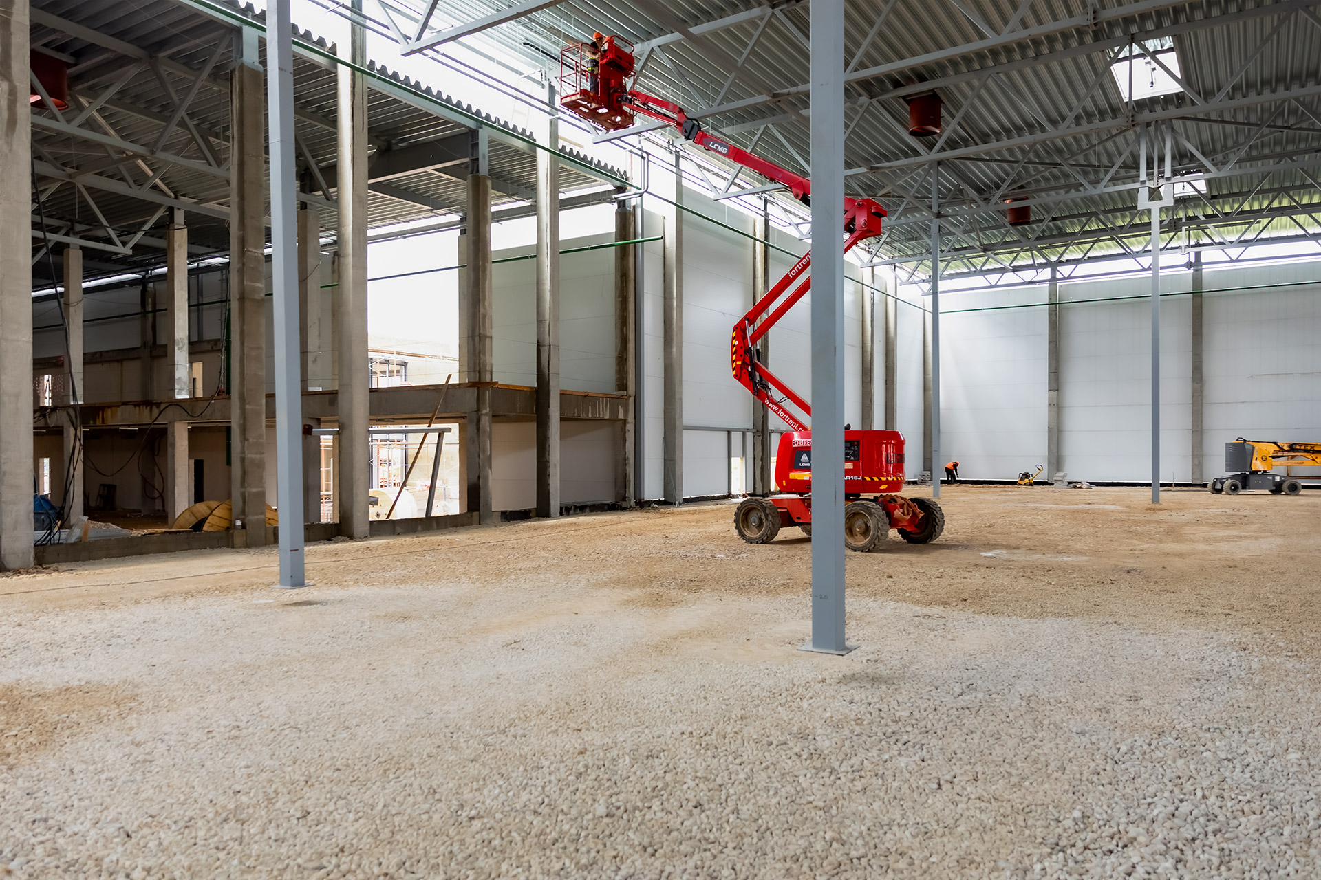 Блоки А Б С: Бетонирование плит пола, стяжки пола мезонинов, цокольной стены и оснований под доквеллеры. Монтаж металлоконструкций фасадов, сэндвич-панелей, ворот и витражей. Огнезащита на металлоконструкций. Устройство кровли. Возведение, штукатурка и шпаклевка газобетонных стен, укладка плитки. Монтаж систем отопления, водоснабжения, электроснабжения, освещения, канализации.