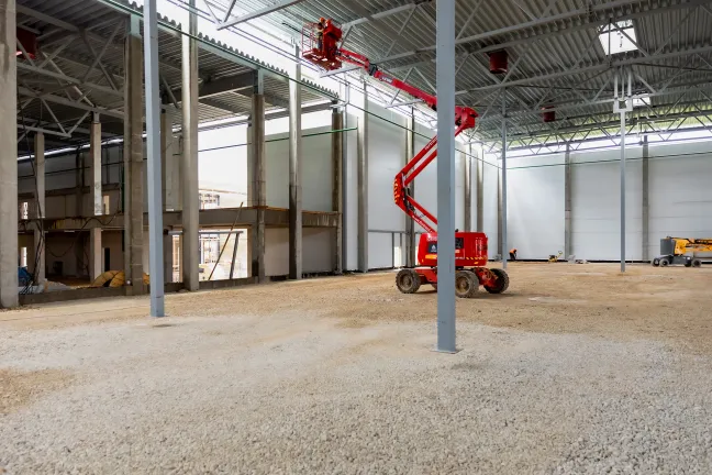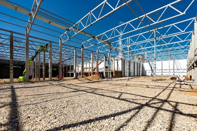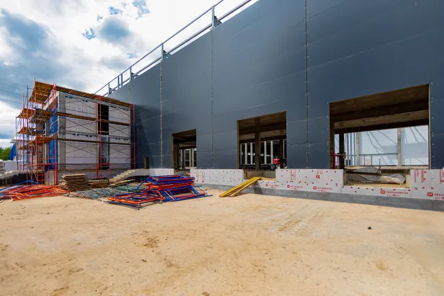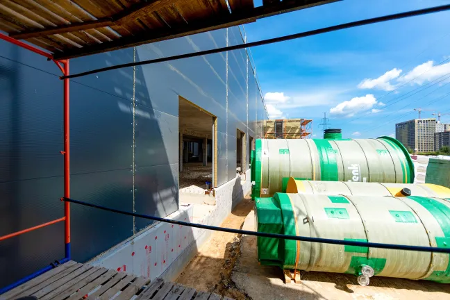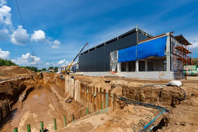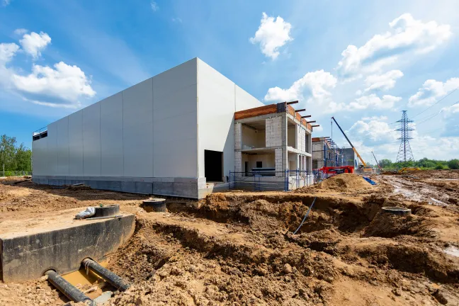 ИТП: Бетонирование фундаментной плиты, монтаж металлоконструкций и сэндвич-панелей.