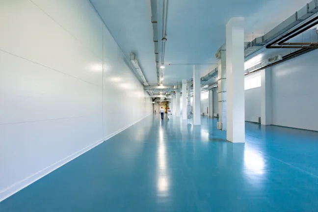 Перегородки для чистых помещений выполнены из собранных в стык сэндвич-панелей с герметичными соединениями и специальными скругляющими элементами. Полы из антистатического линолеума. Фильтры очистки воздуха и светильники встроены в потолочные панели заподлицо с внутренней поверхностью. Инженерные коммуникации размещены за подвесным потолком с возможностью обслуживания. Неоткрываемые окна выполнены заподлицо с поверхностью перегородок.