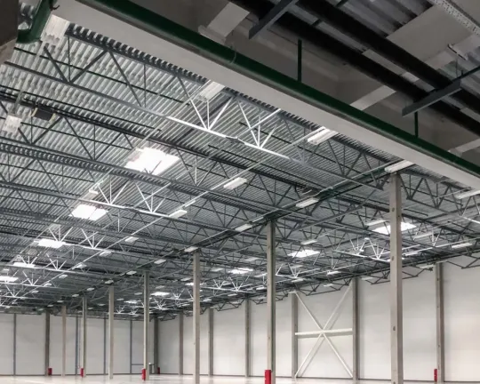 Шаг колонн в зданиях 12х24 м. Высота до низа ферм 12 м. Бетонный пол с антипылевым покрытием рассчитан на нагрузку 7 тонн/м². Здание оборудовано транспортными доками с доквеллерами и тентовыми герметизаторами из расчета 1 док на 1 000 м². Для сокращения эксплуатационных затрат в кровле установлены световые зенитные фонари.