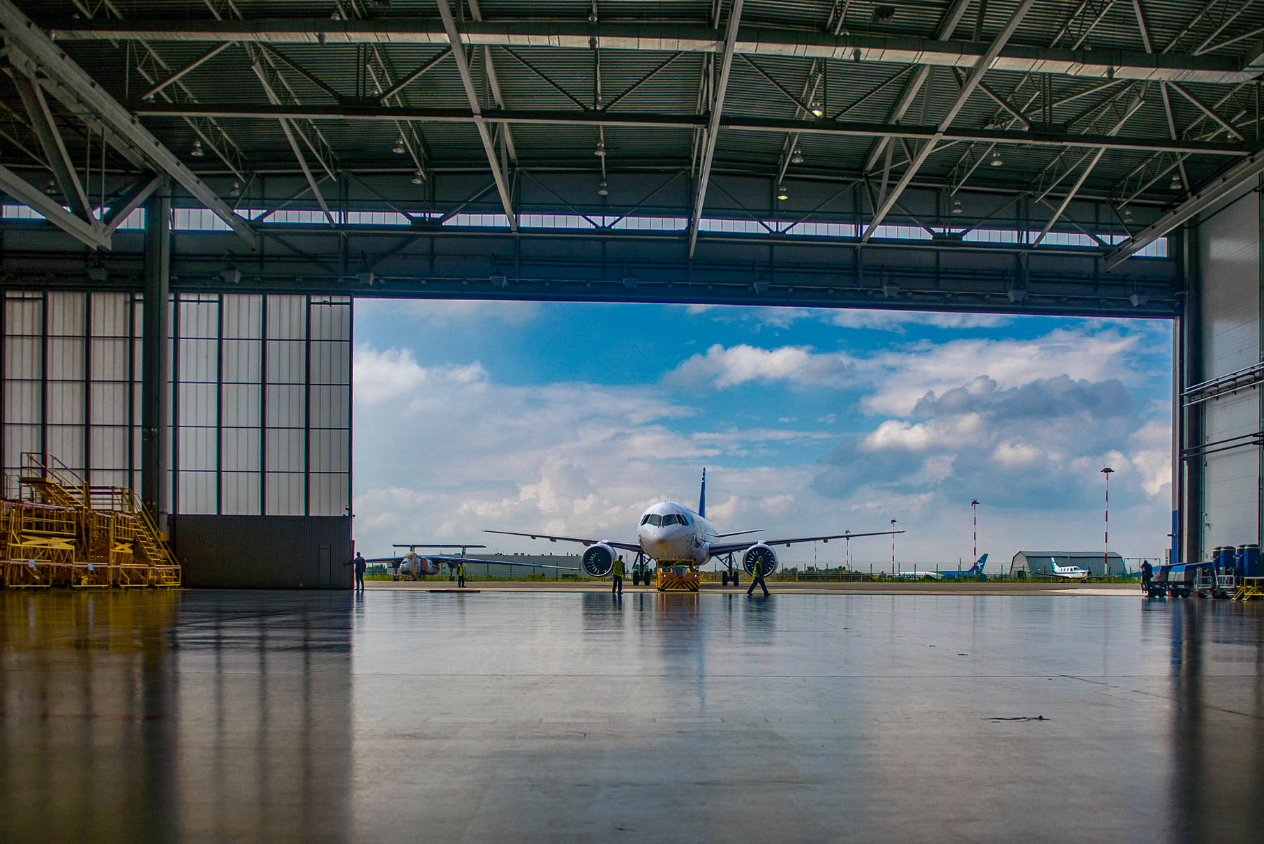 В ангаре размером 153 х 65 м могут одновременно разместиться три воздушных судна МС-21-300. Простую транспортировку самолетов обеспечивают огромные сдвижные светопрозрачные ворота шириной 50 и высотой 14,2 метров и идеально ровный пол с износостойким искробезопасным покрытием.