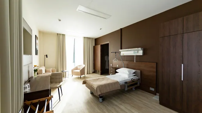В палатном блоке разместятся досуговый центр, спортивный зал, столовая, сауна, тренажерные залы, врачебные и лечебные кабинеты, палаты пациентов, общей вместимостью 60 койко/мест, технические, административные и вспомогательные помещения.
