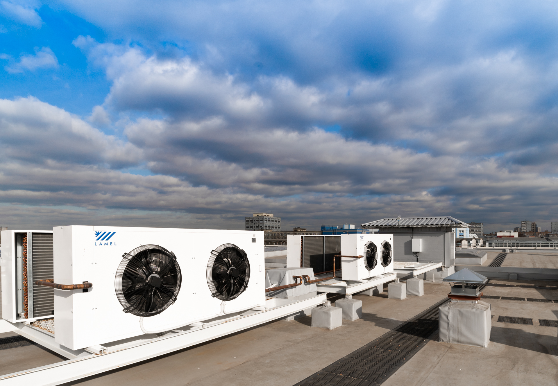 Здание оборудовано централизованным тепловым пунктом, мощными системами вентиляции с рекуперацией и системой отопления смешанного типа: водяные тепловентиляторы и воздушно-тепловые завесы в помещениях первого этажа, и водяные панельные радиаторы на втором и третьем этажах.