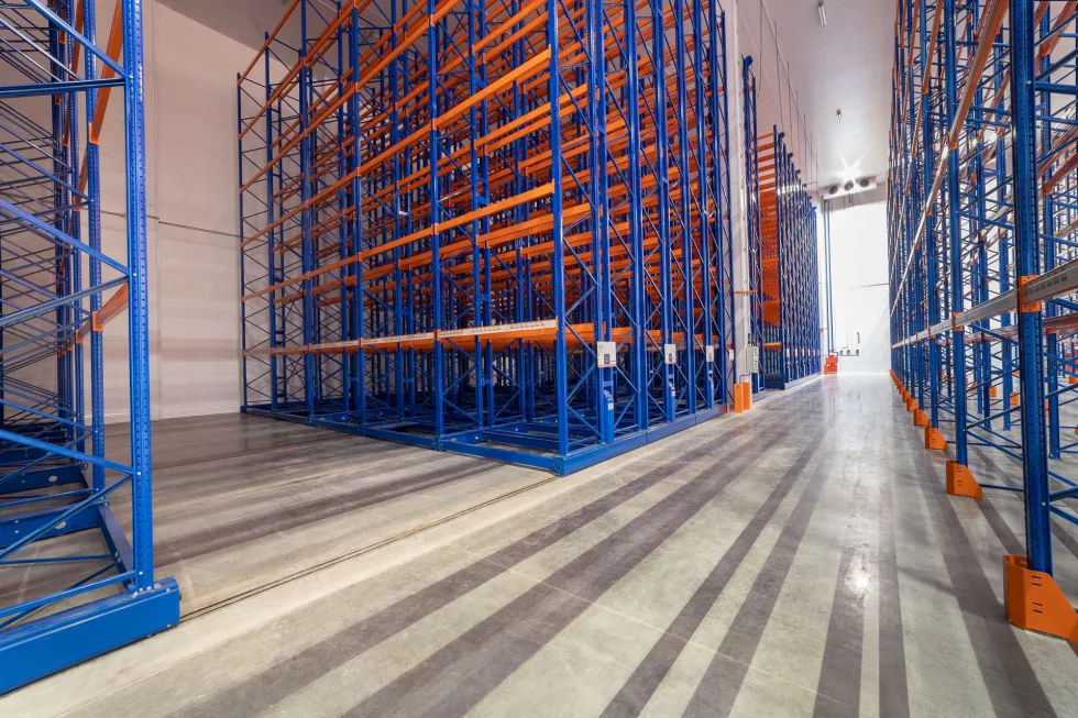 In the low-cold room, dynamic racks on mobile platforms were installed, which more than doubled the useful storage density from 1.94 pallets/m² to 4.22 pallets/m².