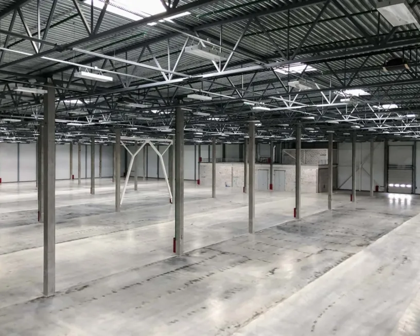 Шаг колонн в зданиях 12х24 м. Высота до низа ферм 12 м. Бетонный пол с антипылевым покрытием рассчитан на нагрузку 7 тонн/м². Здание оборудовано транспортными доками с доквеллерами и тентовыми герметизаторами из расчета 1 док на 1 000 м². Для сокращения эксплуатационных затрат в кровле установлены световые зенитные фонари.