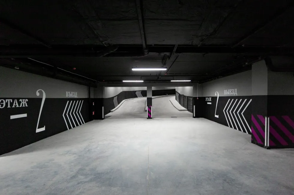 На любом из 7 лифтов прямо из апартаментов можно будет спуститься в 2-уровневый подземный паркинг для 130 автомобилей и 48 малогабаритных транспортных средств.