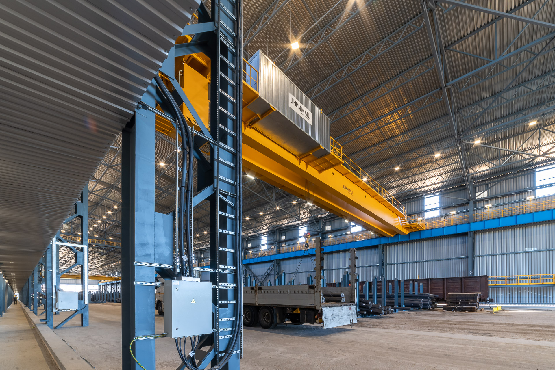 На стальных колоннах здания смонтированы подкрановые пути для трех большепролетных мостовых кранов, грузоподъемностью 12 т каждый. Отметка головки рельса подкранового пути +11,000 м.