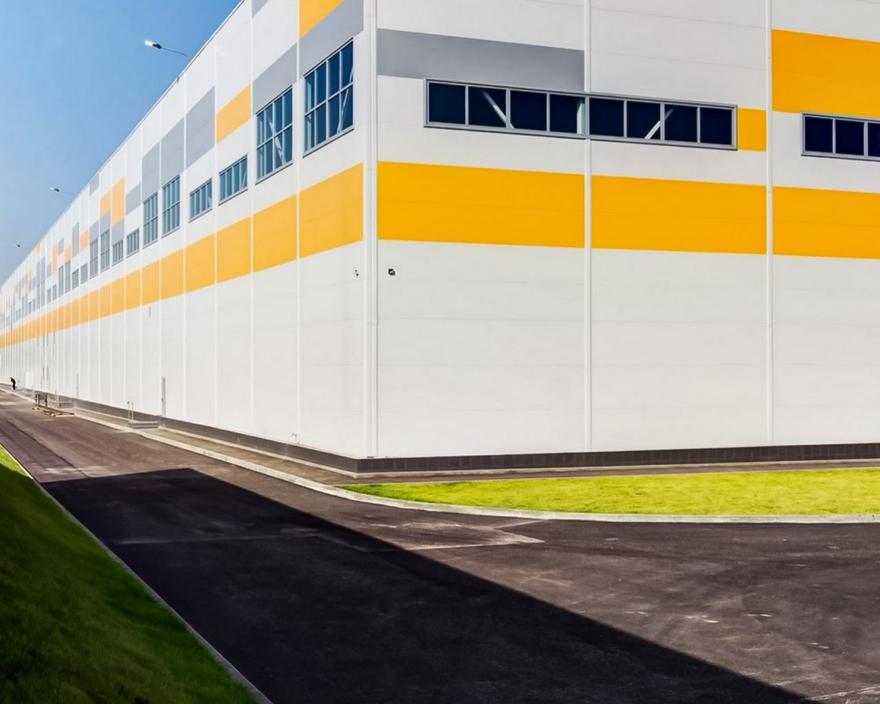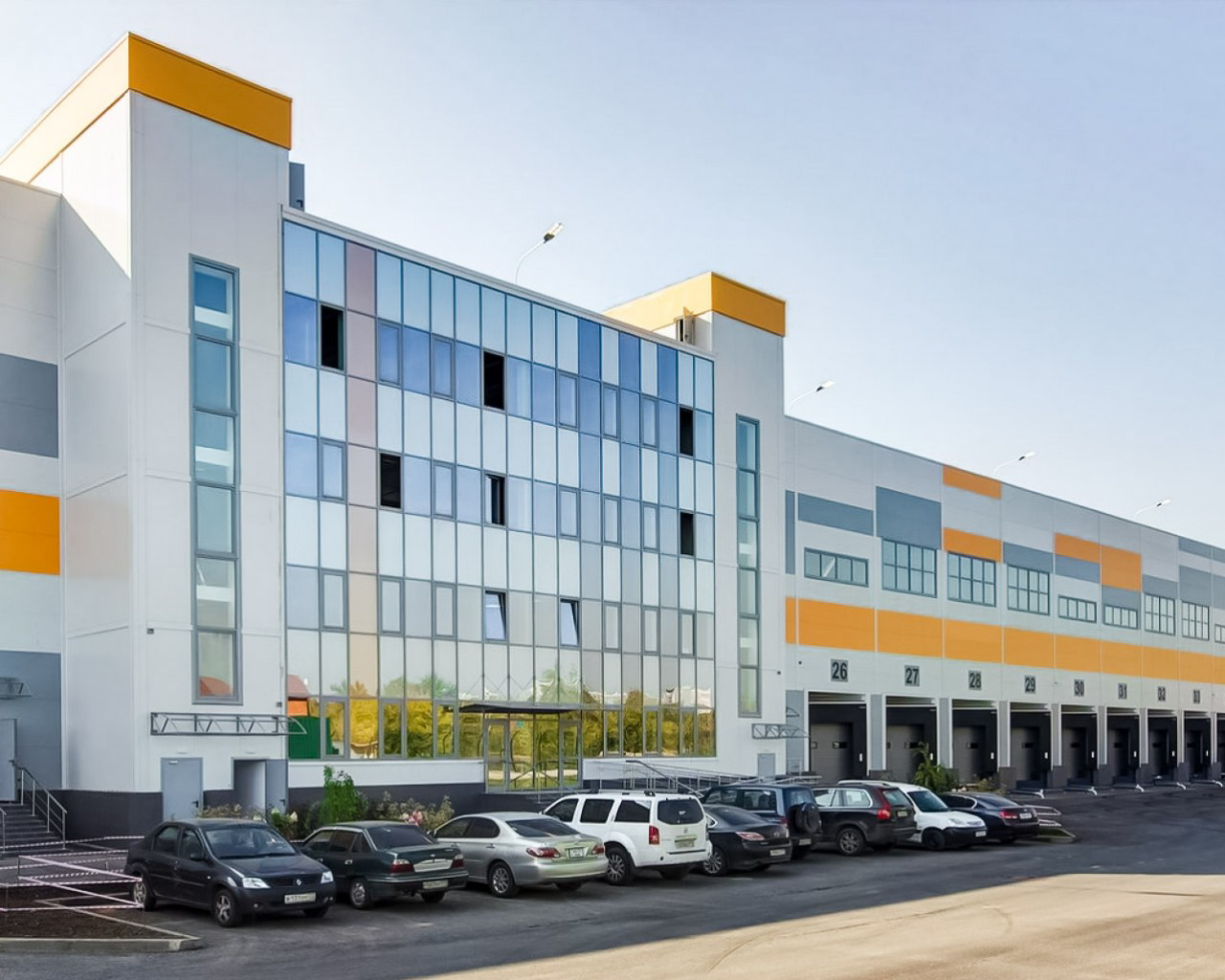 Складская зона одноэтажная, со встроенным мезонином, зоной погрузки/разгрузки и зоной высокостеллажного хранения. Оборудована оконными проемами для естественного освещения. Высота до низа ферм 12 м.